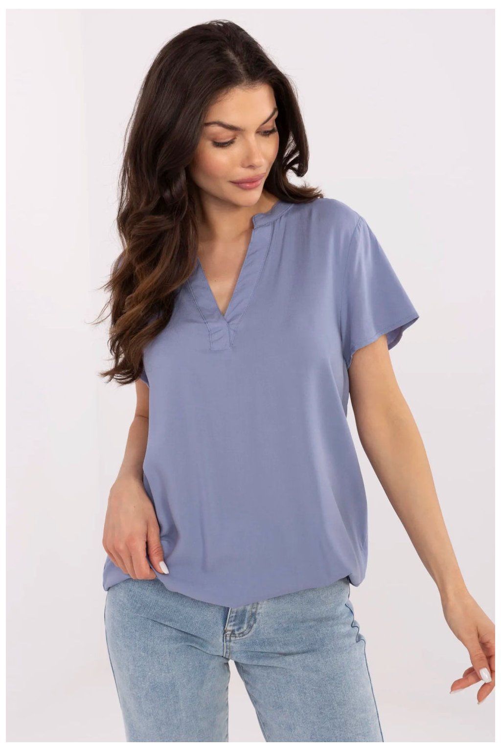 Univerzální košile s casual charakterem, vytvořená s ohledem na každodenní pohodlí a uvědomělý výběr. Vyrobená z příjemné viskozy šetrné k pokožce, je nejen lehká a prodyšná, ale také šetrná k životnímu prostředí. Model s standardní délkou a krátkým rukávem se skvěle hodí na teplejší dny. Hladká struktura materiálu usnadňuje styling, a výstřih do V spojený s elegantním stojáčkem dodává celku originálního charakteru. Ideální volba pro ženy, které oceňují jednoduchost, pohodlí a módu v souladu s přírodou.