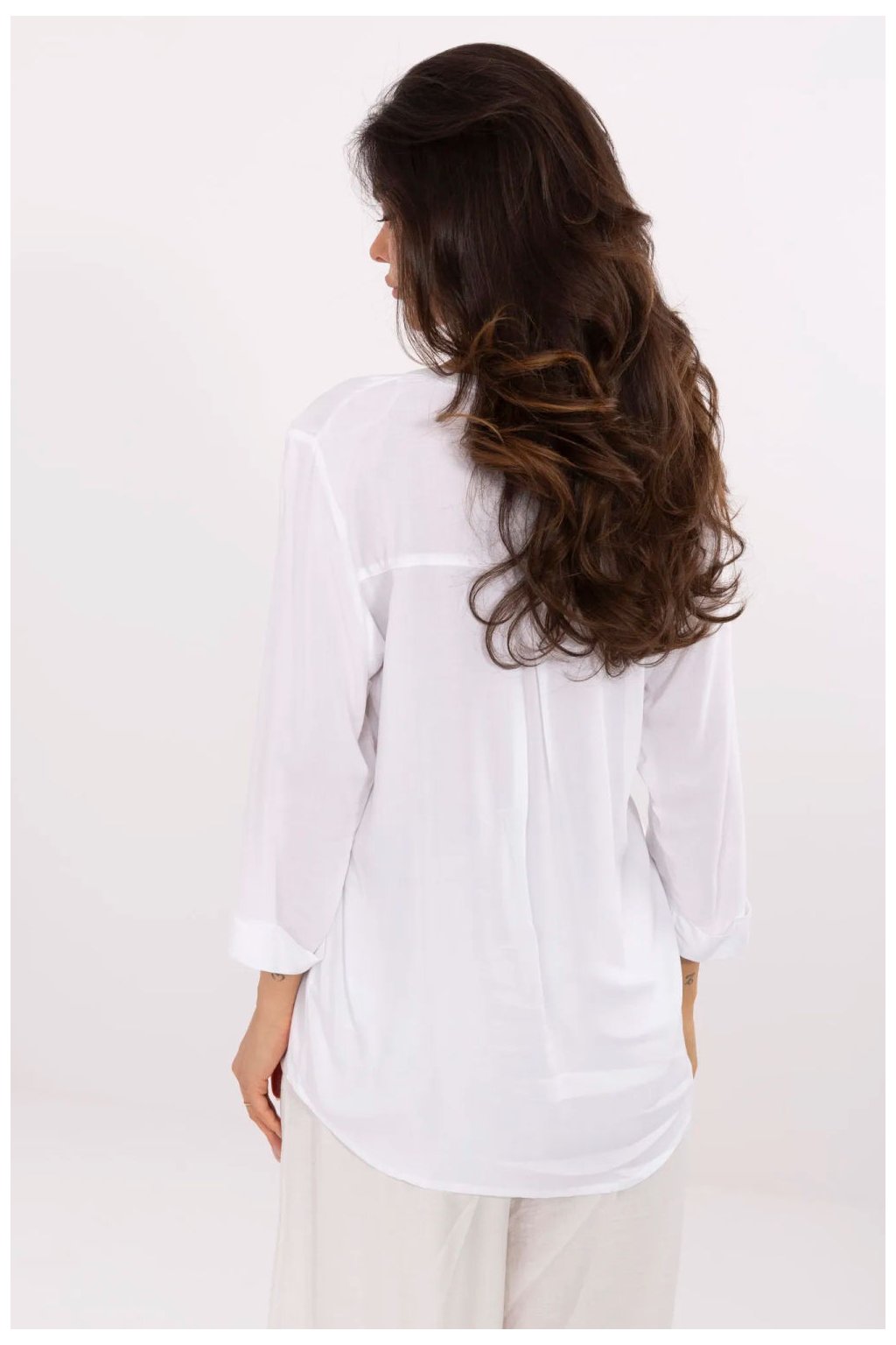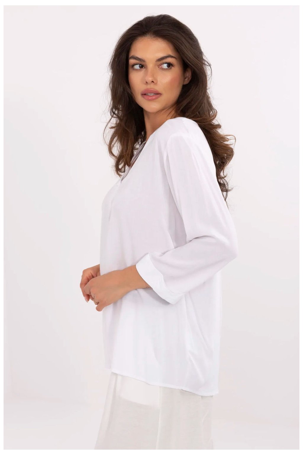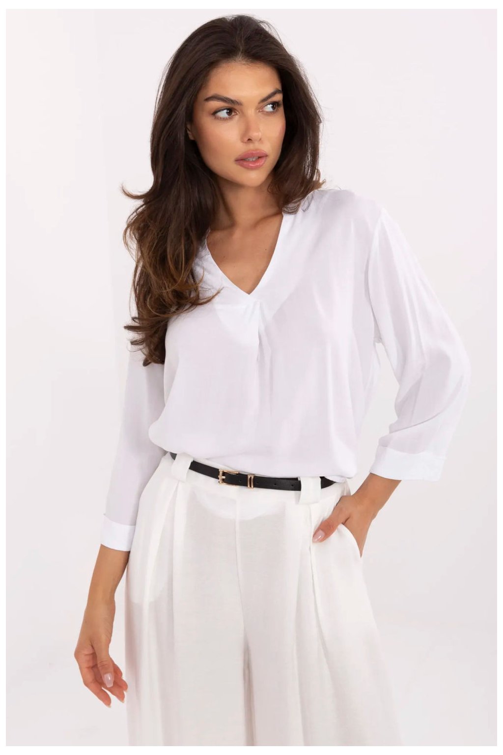 Každodenní volnější košile je ideální nabídkou jak pro běžné nošení, tak i do práce. Ušitá z příjemného, ekologického viskózu, kombinuje pohodlí nošení s ohledem na životní prostředí. Model s hladkým zpracováním, s výstřihem do V a s 3/4 rukávem, vypadá elegantně a žensky. Jemným ozdobným prvkem je jemný záhyb vpředu, který dodává celku jemný půvab a lehkost. Standardní délka a absence zapínání zajišťuje, že košile je pohodlná a snadno se obléká. Jedná se o univerzální a stylovou nabídku, která se hodí do mnoha každodenních stylizací.