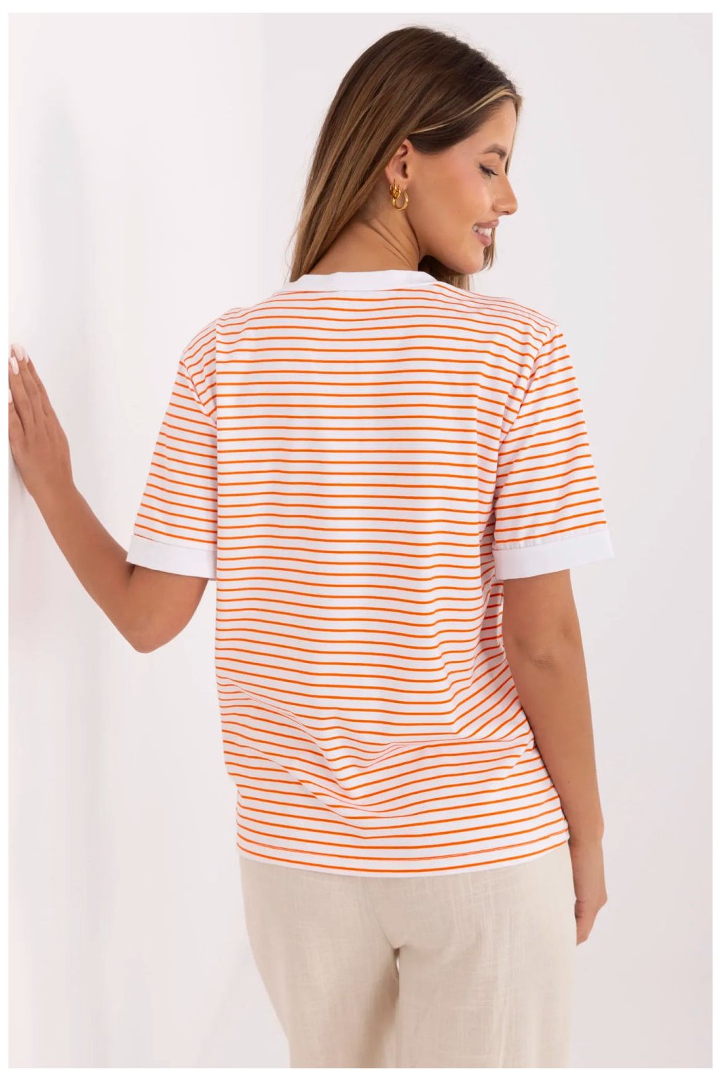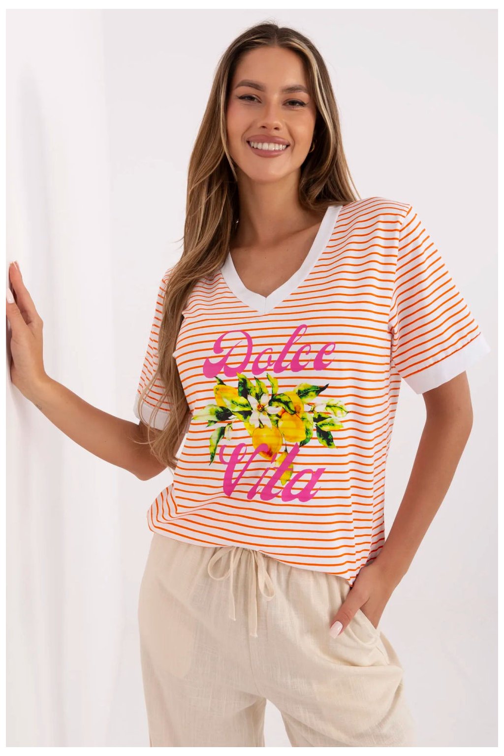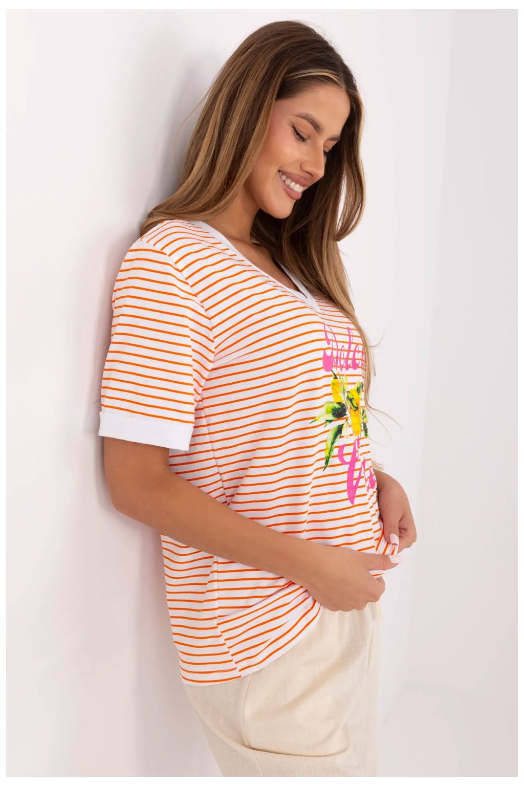 Pohodlný a stylový top s casual charakterem, ideální na každý den i do práce. Vyrobený z prodyšné směsi bavlny s přídavkem elastanu, zaručuje pohodlí a jemné přizpůsobení postavě. Standardní délka a krátký rukáv dělají z tohoto kousku skvělou volbu na teplé dny, a výstřih ve tvaru V jemně zdůrazňuje krk a přidává ženský půvab. Pruhovaný vzor s potiskem dodává celku moderní akcent, ideální pro ženy, které rády spojují pohodlí s výrazným stylem. Skvěle ladí jak s džíny, tak s sukni, nezbytný kousek v každodenní šatníku!