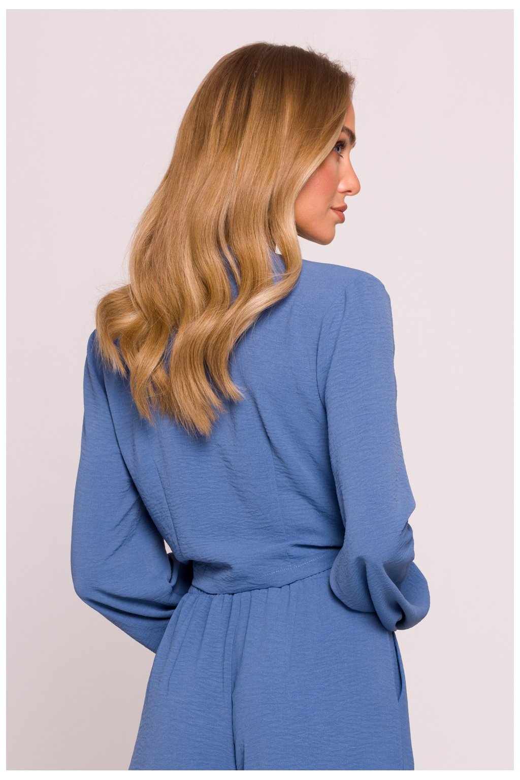 Elegantní top vyrobený z lehkého, krepu tkaniny s výraznou strukturou a matným povrchem. Krátký střih typu crop top, který končí v pasu, krásně zdůrazňuje postavu a skvěle se hodí jak k vysokým kalhotám, tak k vrstveným stylizacím. Model se vyznačuje hlubokým výstřihem ve tvaru písmene V, zapínáním na diskrétní knoflík a s možností předního zavázání, vytvářející asymetrický, volný uzel. Dlouhé nadýchané rukávy s elastickou gumou na koncích dodávají blůze lehkost a romantický charakter. Navrženo a ušito v Polsku s důrazem na detaily a pohodlí nošení.