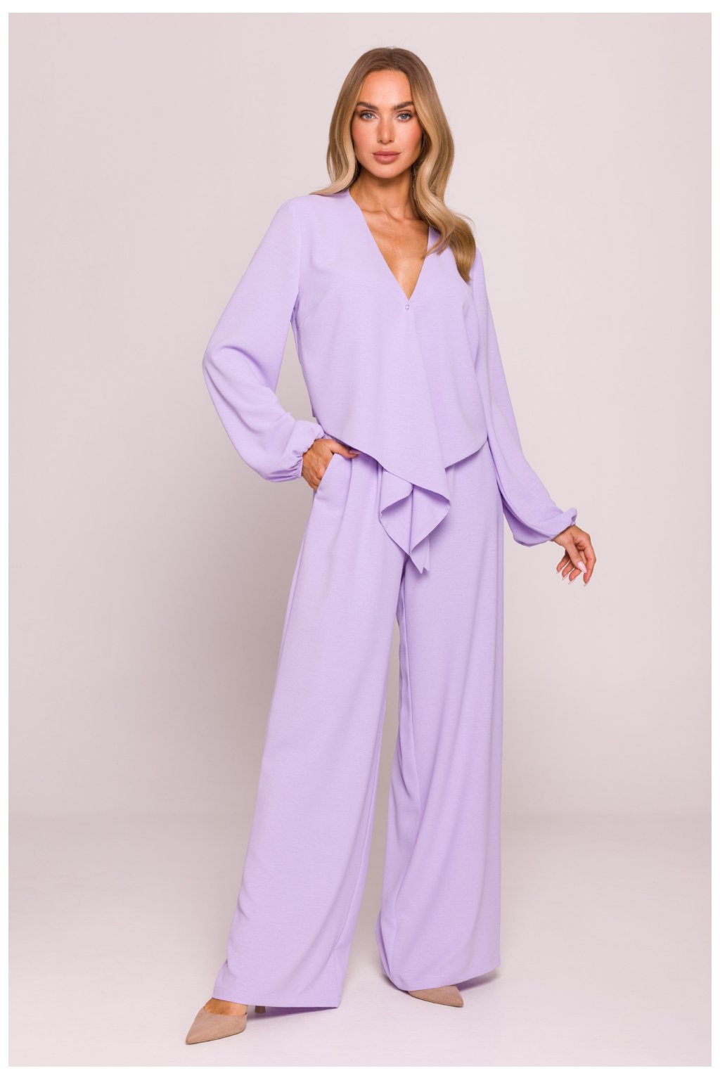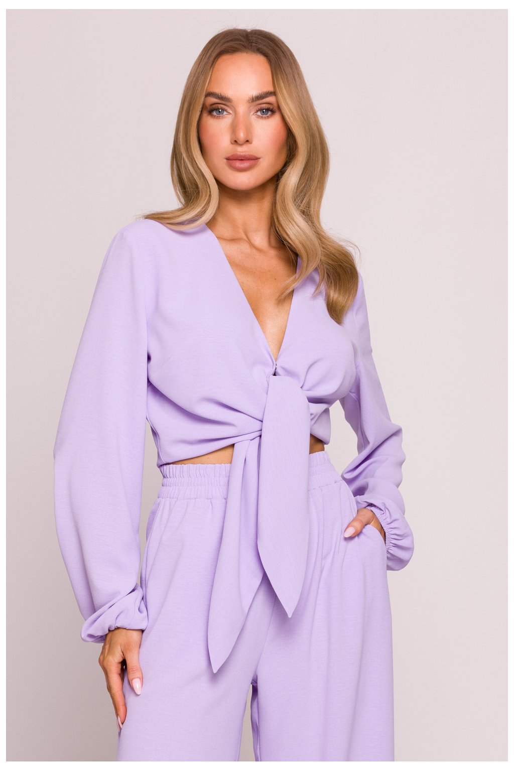 Elegantní blůza vyrobena z lehké, krepující látky s výraznou strukturou a matným povrchem. Krátký střih typu crop top, který končí v pasu, krásně zdůrazňuje postavu a skvěle ladí jak s vysokým pasem, tak s vrstvenými stylizacemi. Model se vyznačuje hlubokým výstřihem ve tvaru písmene V, zapínáním na diskrétní knoflík, s možností předního zavázání, vytvářející efekt asymetrického, volného uzlu. Dlouhé, nafouklé rukávy zakončené elastickou gumičkou dodávají blůze lehkost a romantický charakter. Navrženo a ušito v Polsku s důrazem na detaily a pohodlí nošení.
