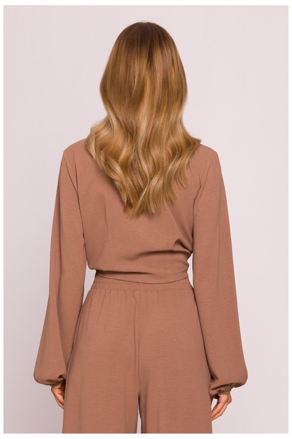 Elegantní top vyrobený z lehké, kreptové látky s výraznou strukturou a matným finišem. Krátký střih typu crop top, který končí v pasu, krásně zdůrazňuje postavu a skvěle ladí jak s vysokým pasem, tak s vrstvenými stylizacemi. Model vyniká hlubokým výstřihem ve tvaru písmene V, zapínáním na diskrétní zip a s možností předního zavázání, tvořící asymetrický, volný uzel. Dlouhé nadýchané rukávy s elastickým lemem dodávají topu lehkost a romantický charakter. Navrženo a ušito v Polsku s důrazem na detaily a pohodlí nošení.