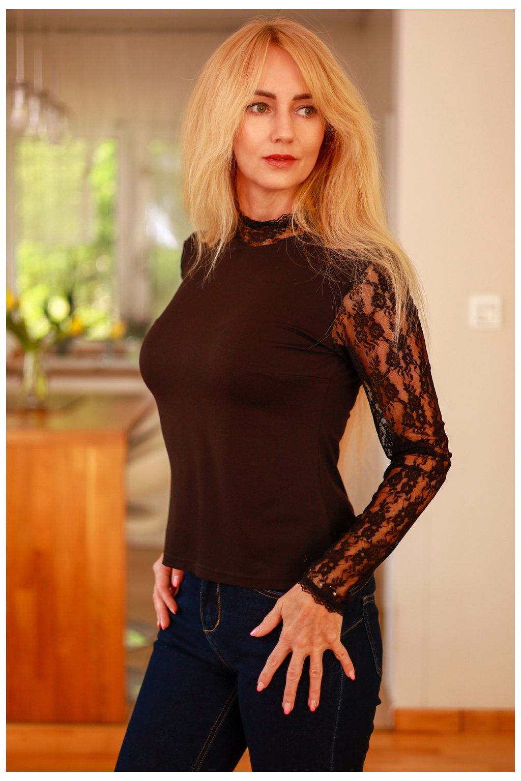 Tori je elegantní, přizpůsobená blůzka z viskózy a vintage krajky. Lehce elastický, prodyšný materiál blůzku krásně padne a dobře se nosí. Stojánek a rukávy jsou vyrobeny z jemné, průsvitné krajky. Blůzka se hodí k elegantním stylizacím, ale stejně dobře vypadá i s džíny.