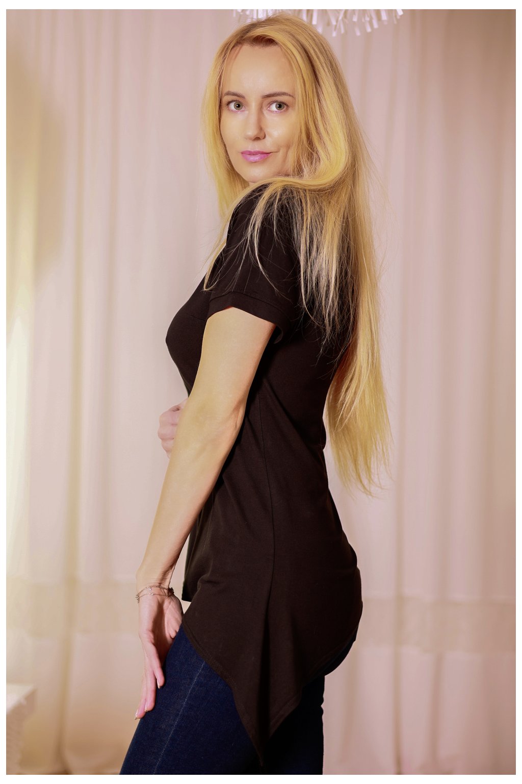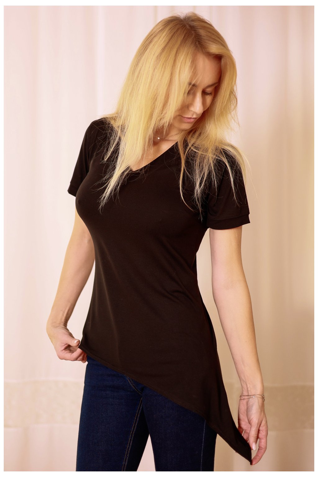 Klasický top s krátkým rukávem, výstřihem ve tvaru písmene V a prodlouženým bočním lemem. Model Aria je vyroben z lehce elastické prodyšné viskózy dostupné ve čtyřech barvách. Pohodlný volný střih se hodí do mnoha stylizací pro jarně letní sezónu.