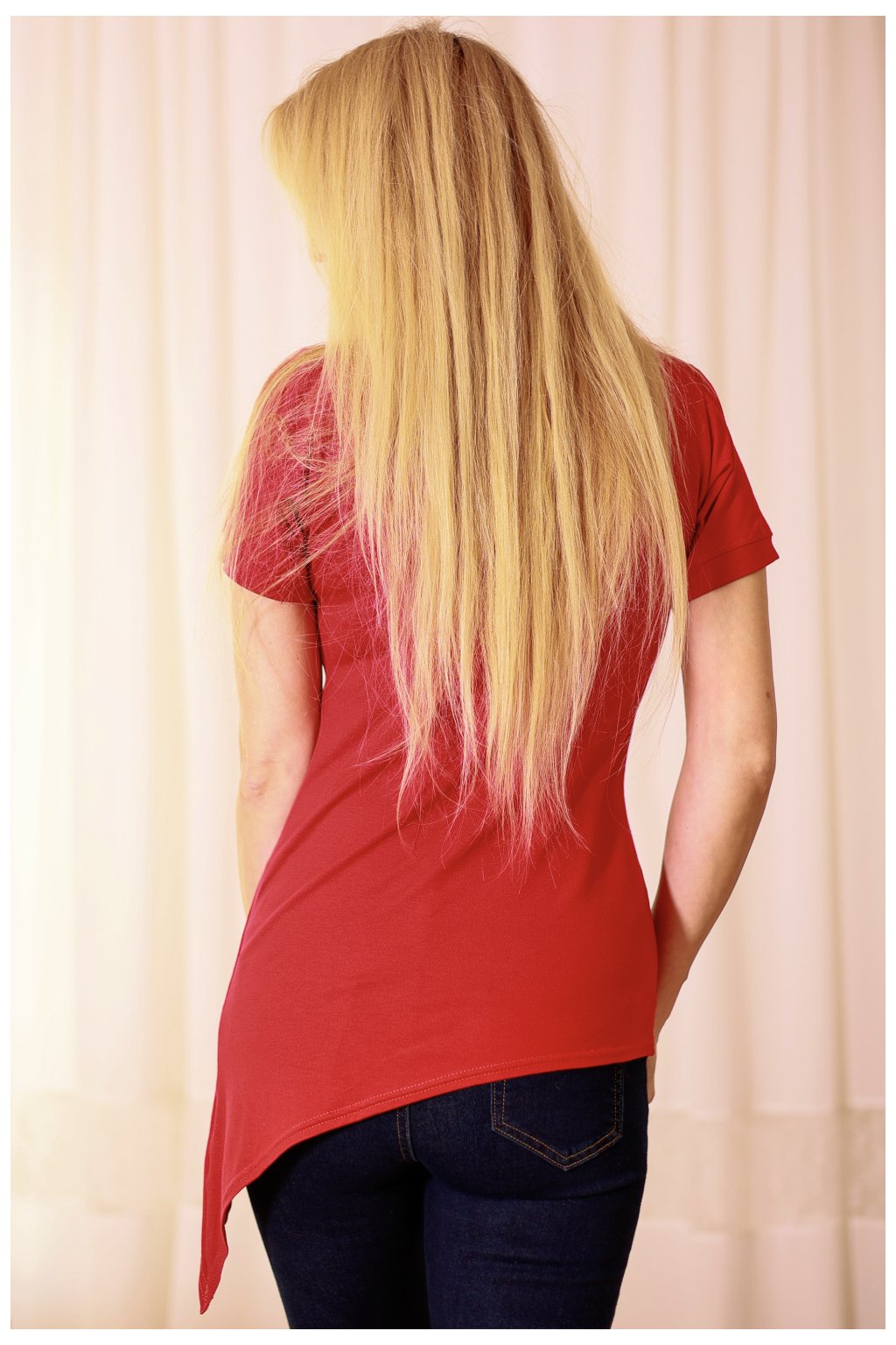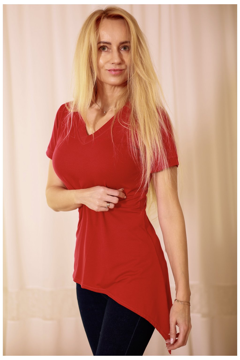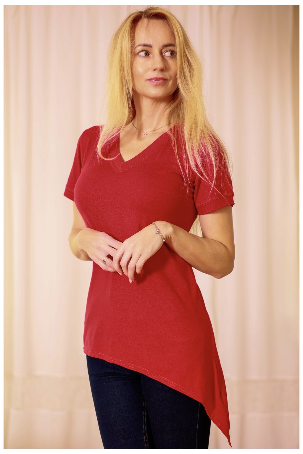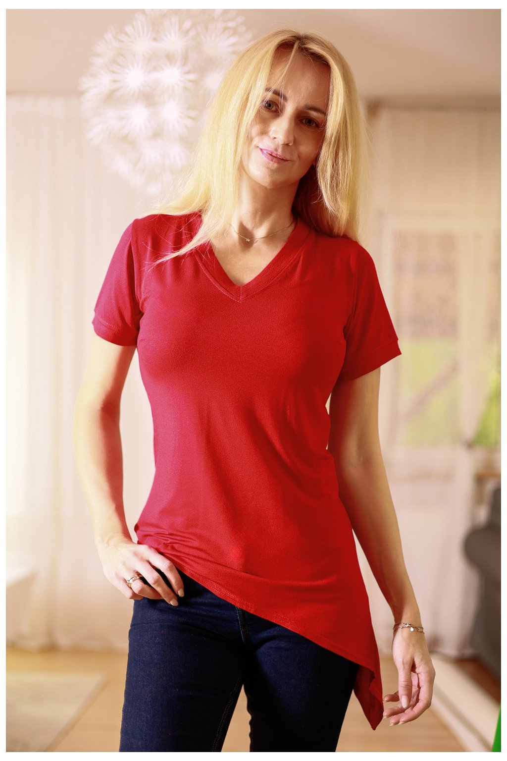 Klasický top s krátkým rukávem, výstřihem ve tvaru písmene V a prodlouženým bokem. Model Aria je vyroben z lehce elastické průhledné viskózy dostupné ve čtyřech barvách. Pohodlný, volný střih se hodí do mnoha stylizací pro jarně letní sezónu.