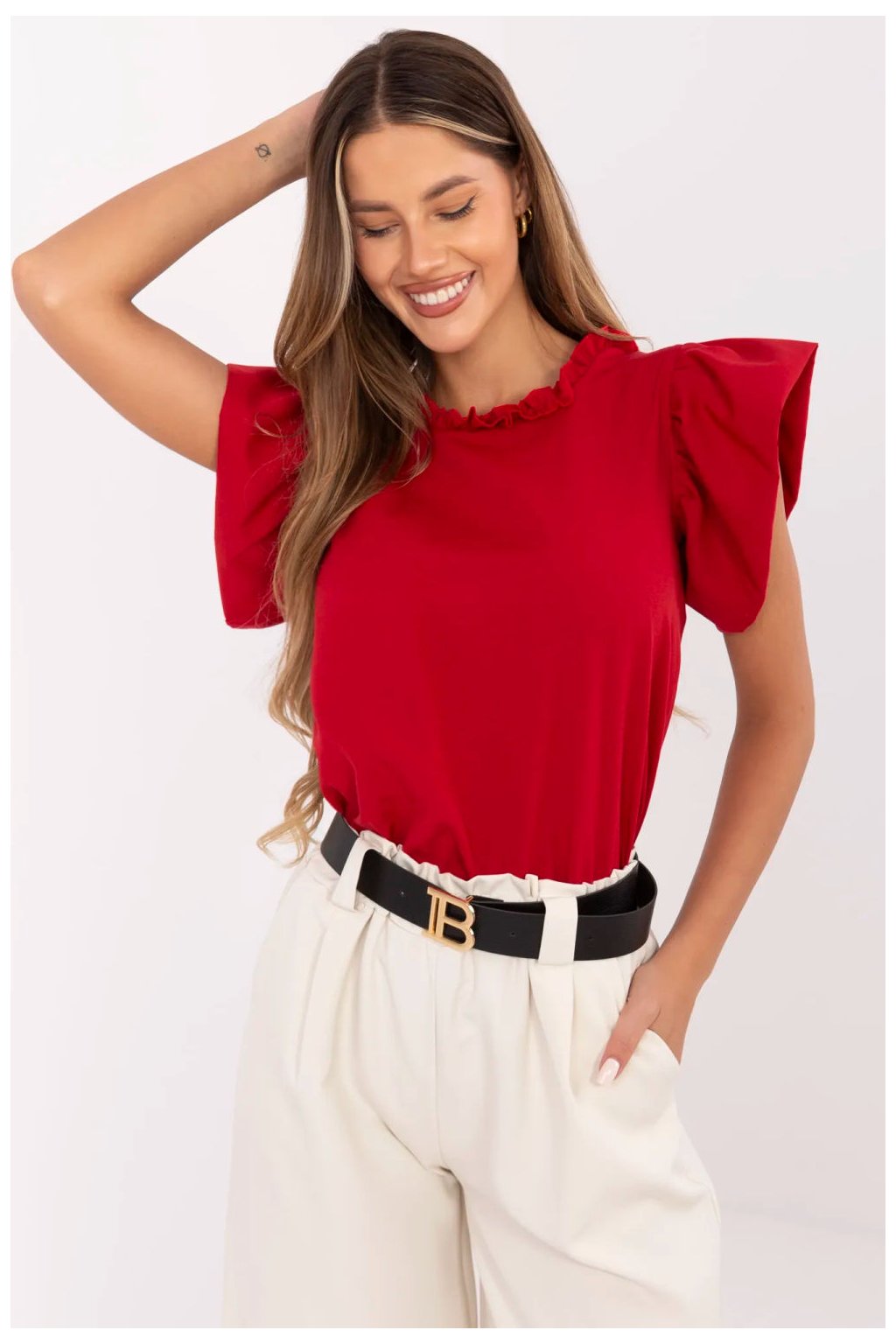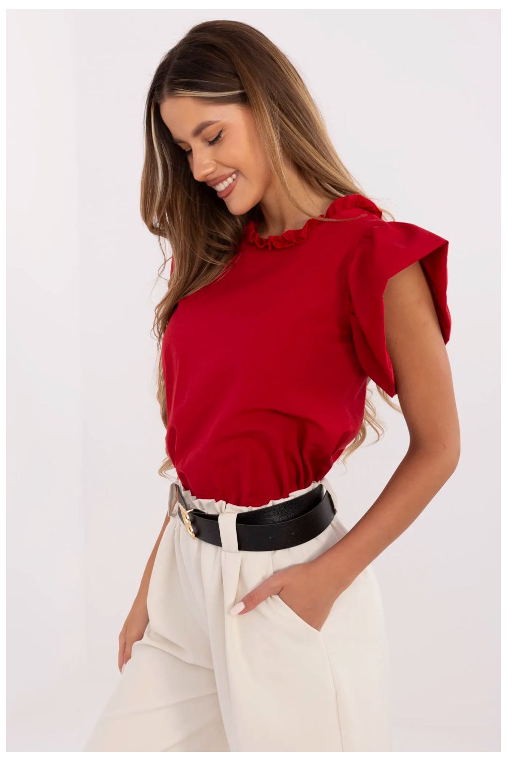 Elegantní blůzka s hladkým finišem je nadčasovým návrhem pro ženy, které si cení klasiky a jemných detailů. Vyrobená z převládající bavlny poskytuje pohodlí při nošení a zároveň vypadá mimořádně stylově a žensky. Blůzka má standardní délku, díky čemuž se skvěle hodí jak k nohavici, tak k sukní. Krátké rukávy ve formě volánků jí dodávají lehkost a romantický charakter, zatímco kulatý výstřih zakončený drobným ozdobným volánkem představuje elegantní akcent, který přitahuje pozornost. Je to ideální volba pro návštěvní příležitosti a do práce, skvěle se hodí do kancelářských stylizací, spojující pohodlí s elegancí.