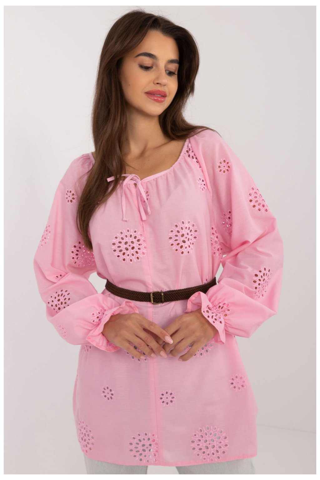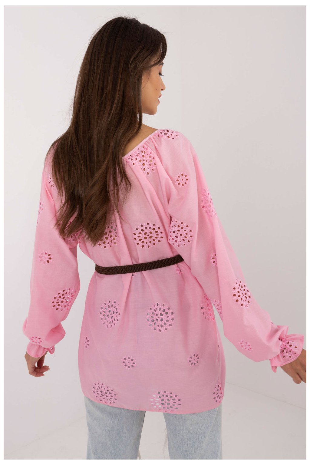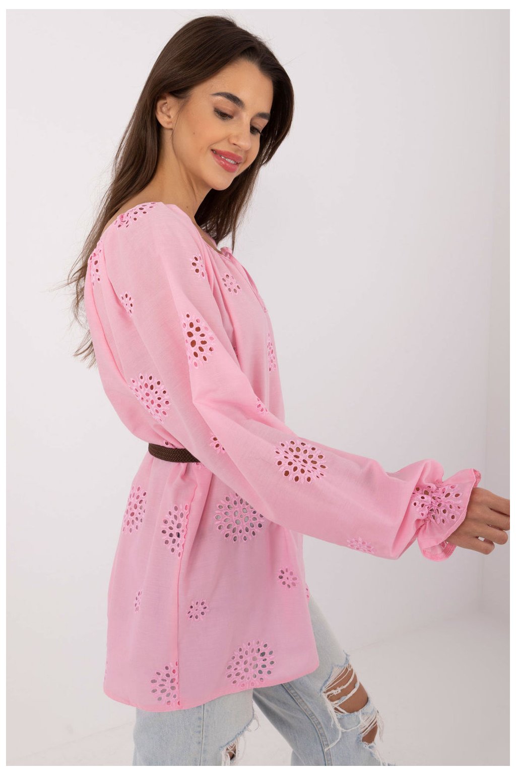 Každodenní blůza v boho stylu je kombinací pohodlí a ženského šarmu. Vyrobena z prodyšné přírodní bavlny, skvěle se hodí na každý den. Model s standardní délkou se vyznačuje průhledným vzorem, který dodává lehkost a jemnost. Dlouhý, nafouklý rukáv dává blůze charakteristický, volný vzhled. Výstřih s ozdobným vázáním podtrhuje romantický boho styl. Je to ideální návrh k džínům, sukním nebo šortkům, skvělý jak na procházku, tak na setkání s přáteli. Součástí je zapínací pásek.