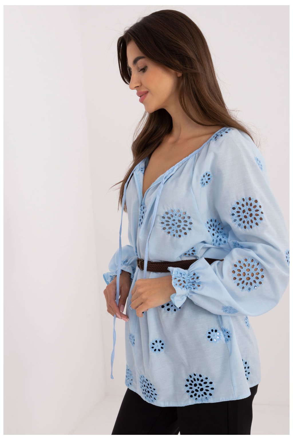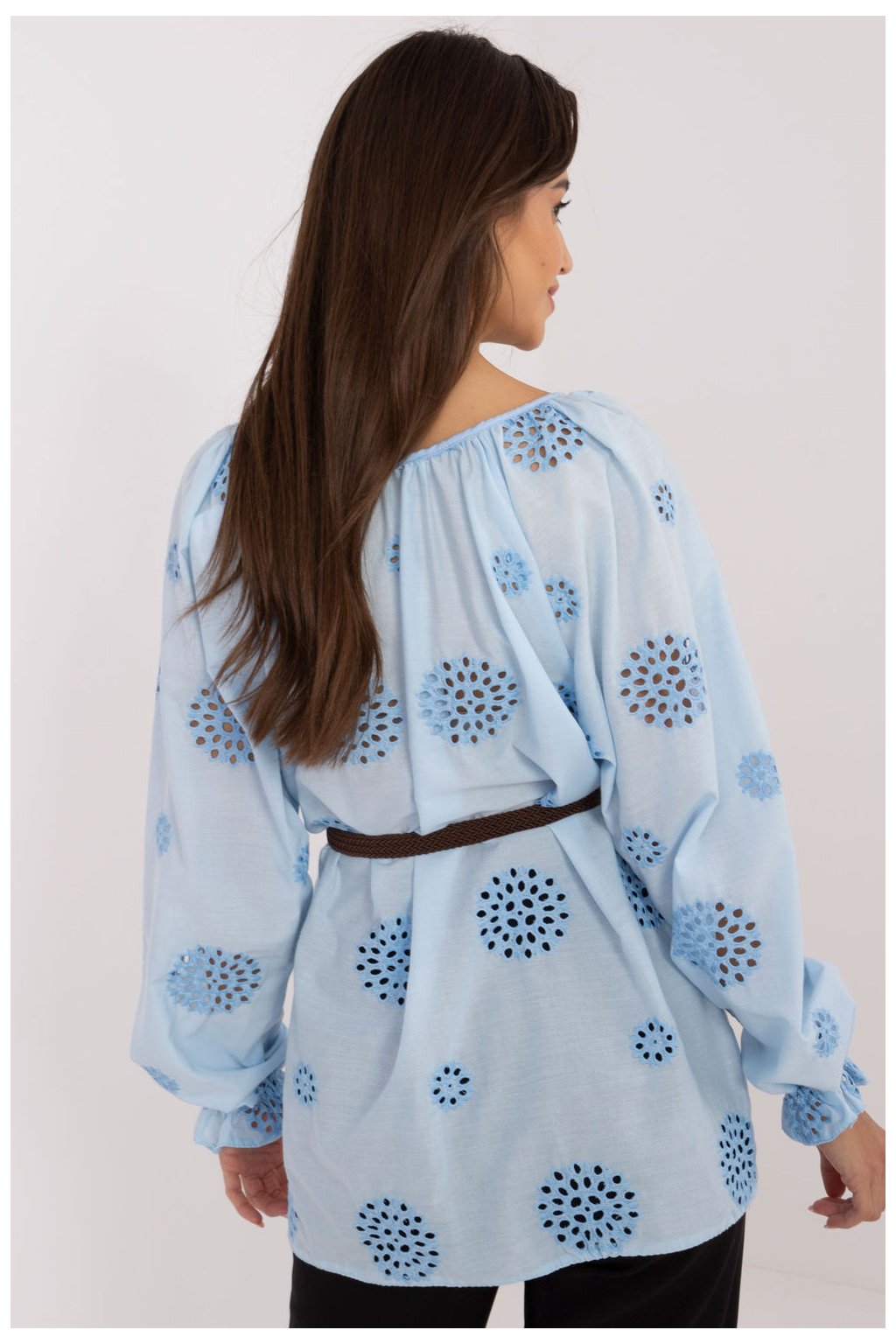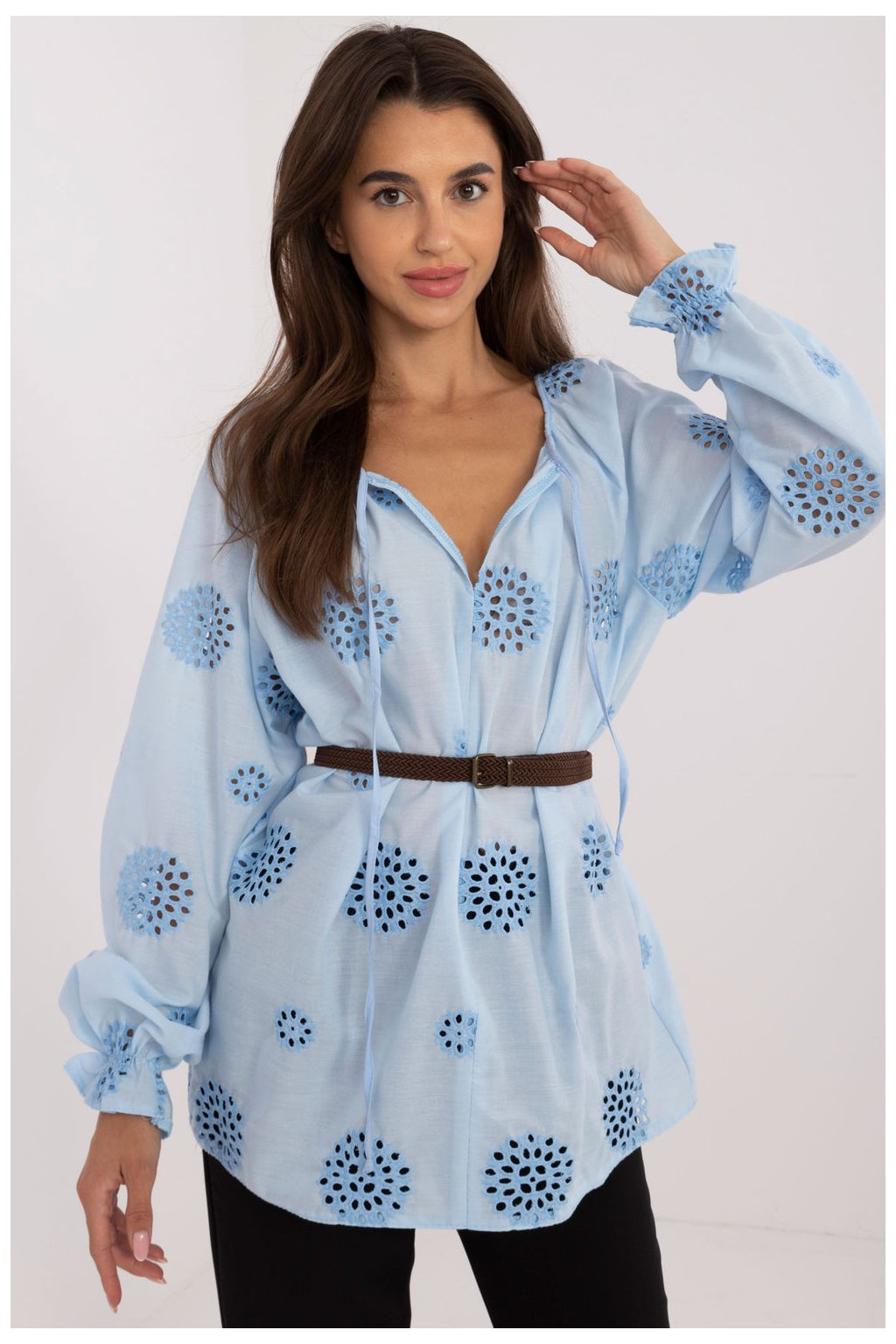 Každodenní blůza v boho stylu je kombinací pohodlí a ženského půvabu. Vyrobená z prodyšné přírodní bavlny, ideální pro každodenní nošení. Model standardní délky se vyznačuje ažurovým vzorem, který dodává lehkost a jemnost. Dlouhý nadýchaný rukáv dodává blůze charakteristický a uvolněný vzhled. Výstřih s ozdobným vázáním zdůrazňuje romantický boho styl. Ideální volba k džínům, sukním nebo kraťasům, skvělá jak na procházku, tak i na setkání s přáteli. Součástí je zapínací pásek.