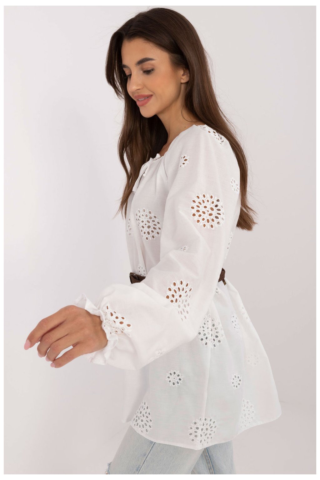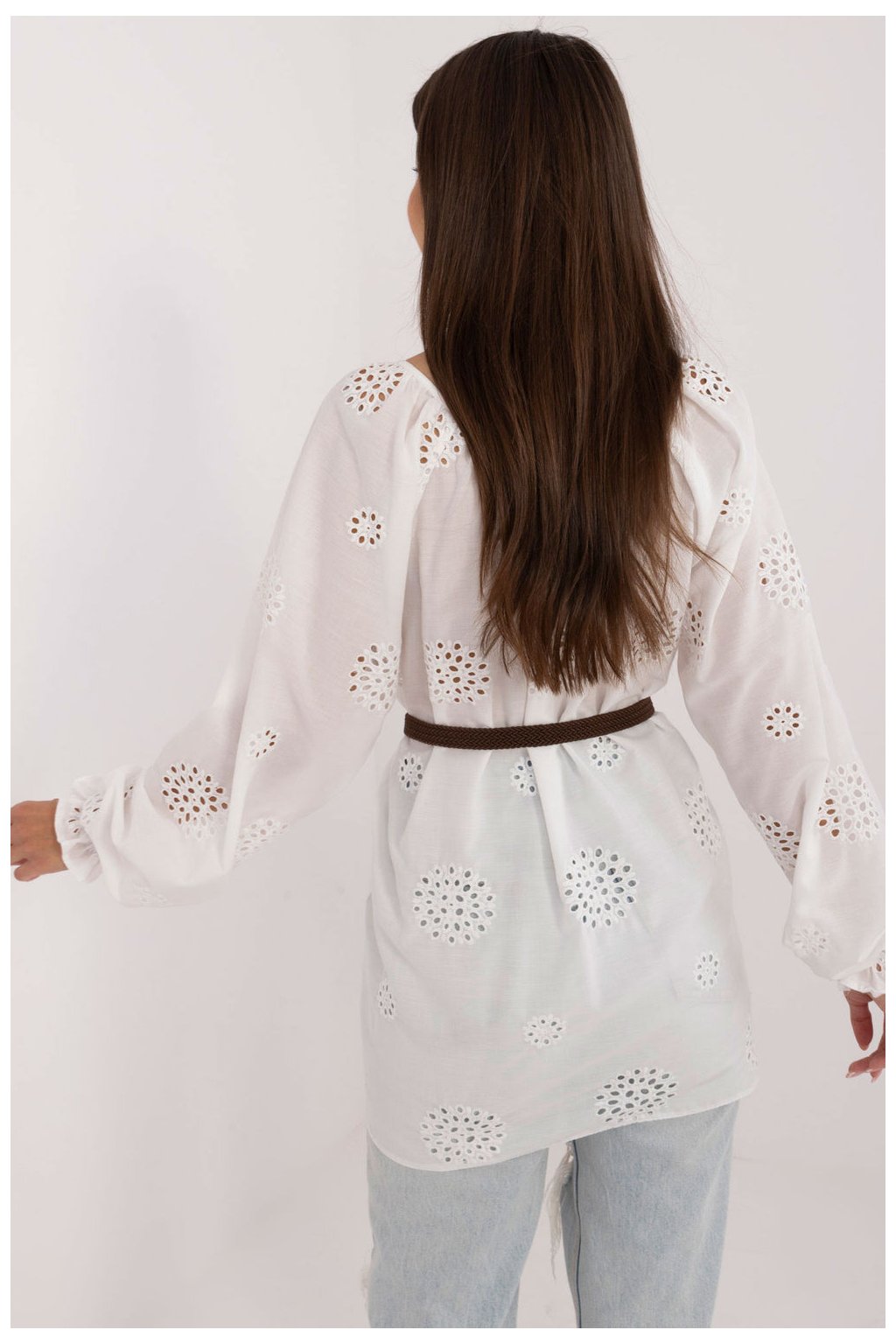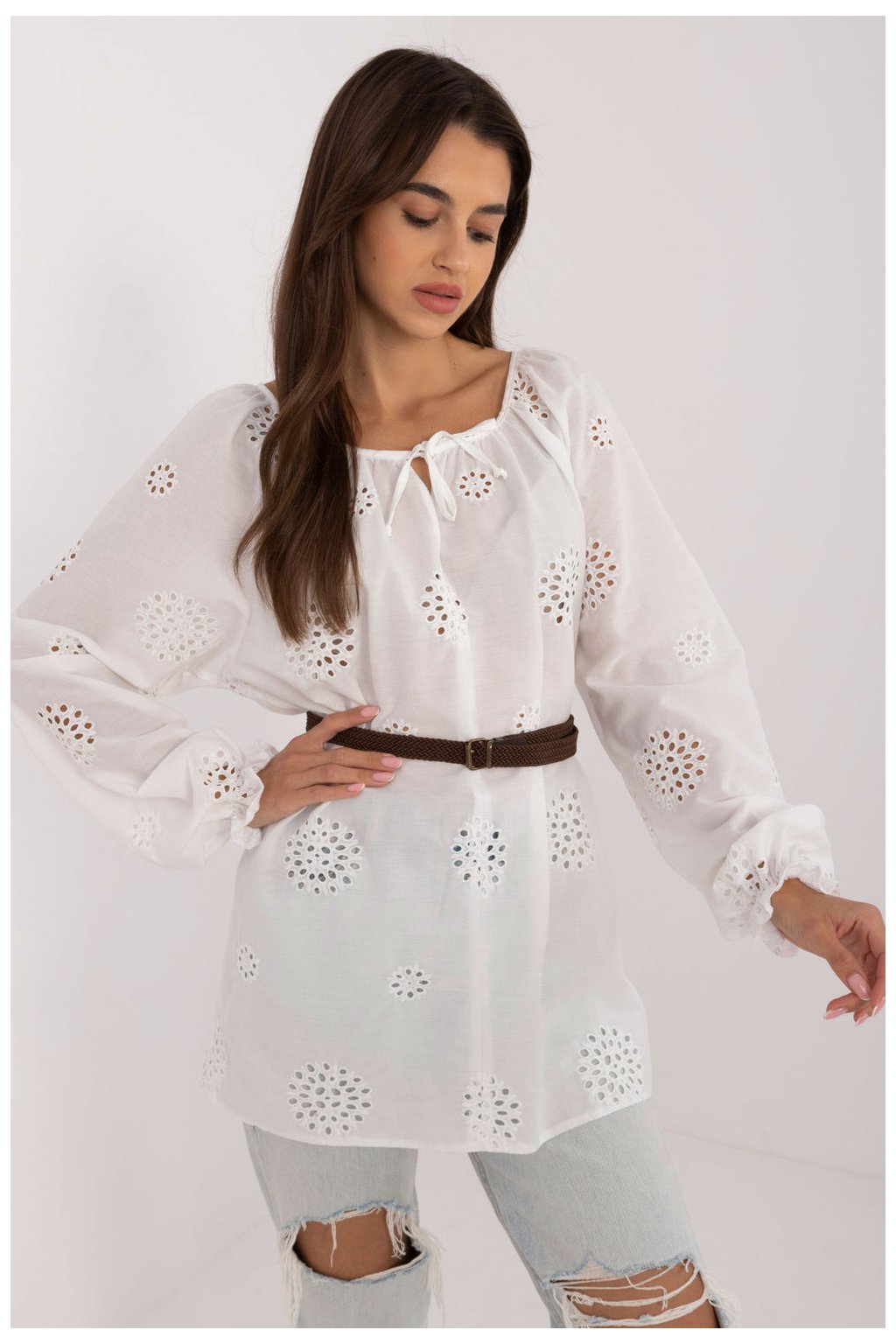 Každodenní blůza v boho stylu je kombinací pohodlí a ženského šarmu. Vyrobená z prodyšné přírodní bavlny, skvěle se hodí na každý den. Model s standardní délkou se vyznačuje ažurovým vzorem, který dodává lehkost a jemnost. Dlouhý nafouklý rukáv dává blůze charakteristický, volný vzhled. Výstřih s ozdobným vázáním zdůrazňuje romantický boho styl. Je to ideální volba k džínům, sukním nebo kraťasům, skvěle se hodí jak na procházku, tak na setkání s přáteli. Součástí je zapínací pásek.