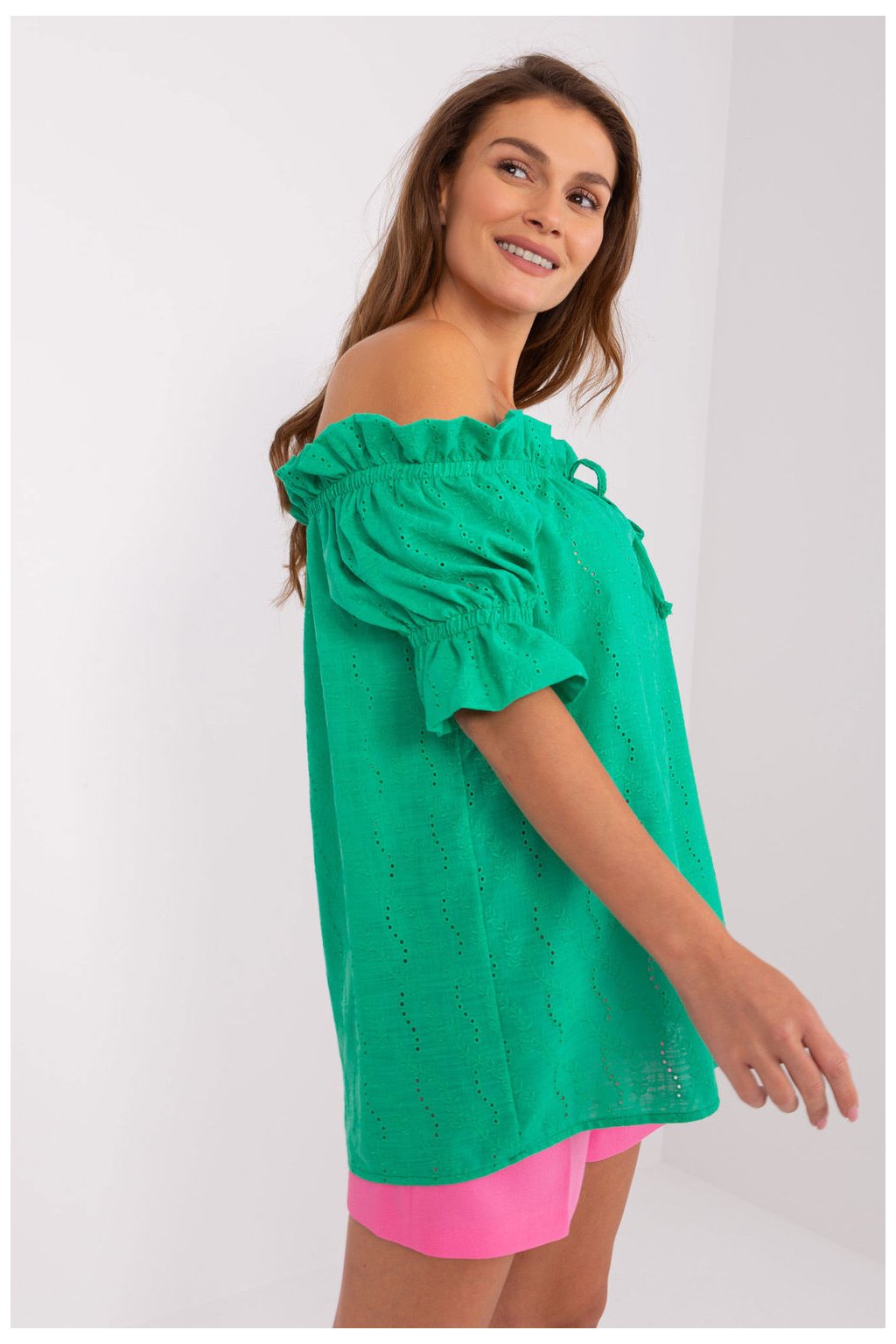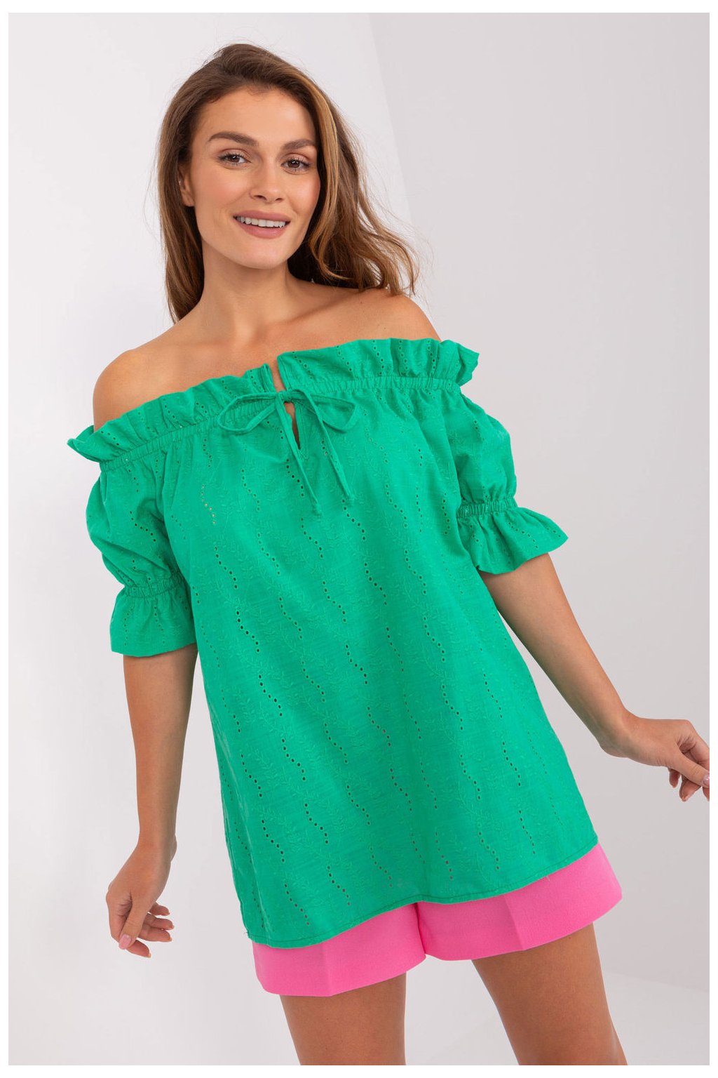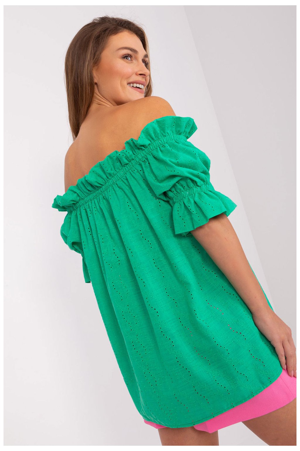 Blůza s krátkým rukávem a výstřihem ve španělském stylu. Blůza z materiálu s ažurovaným vzorem. Ideální na mnoho příležitostí.