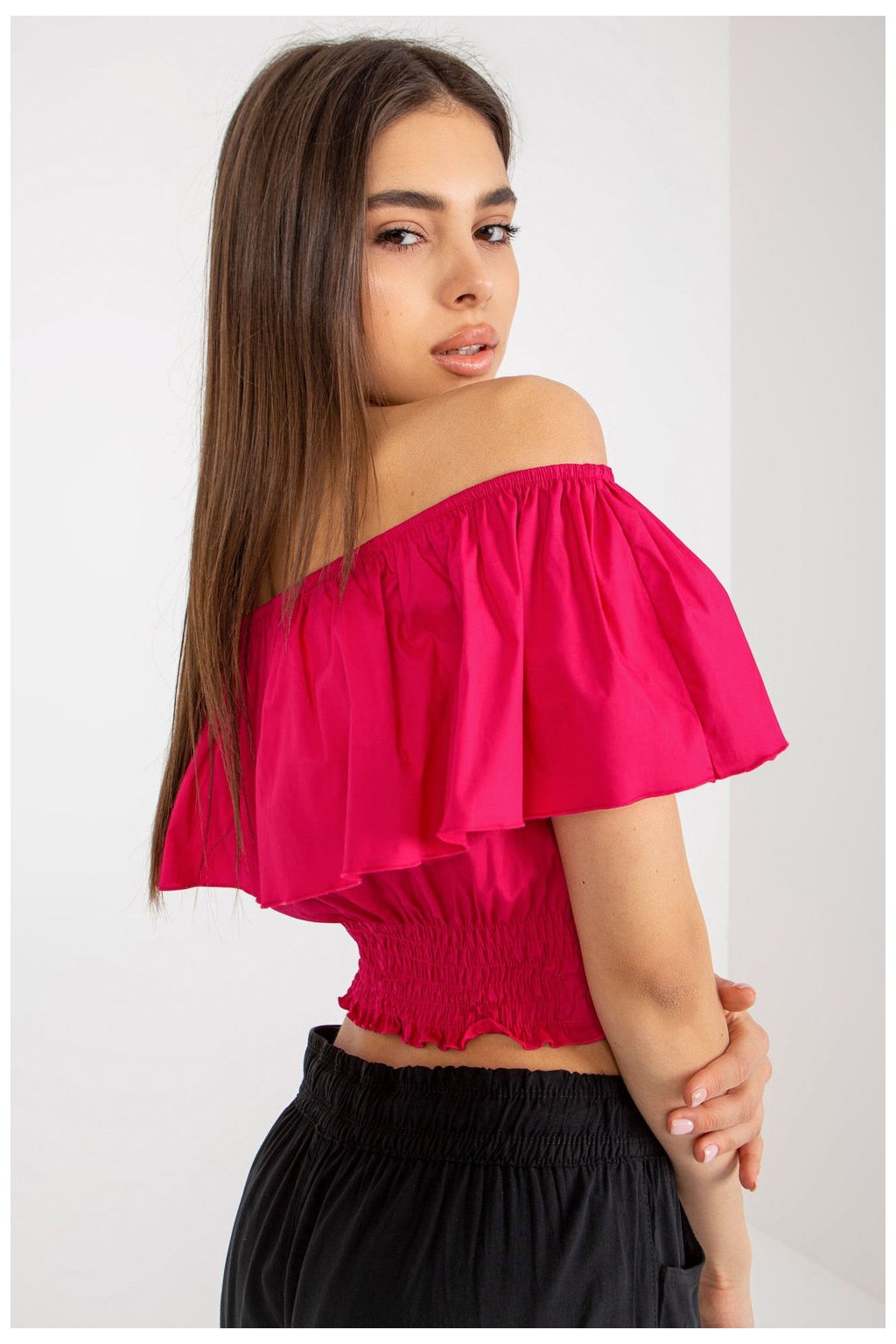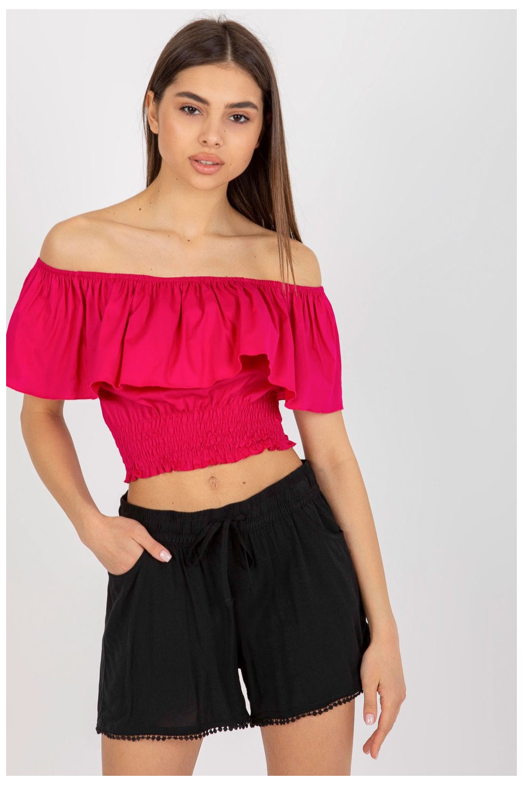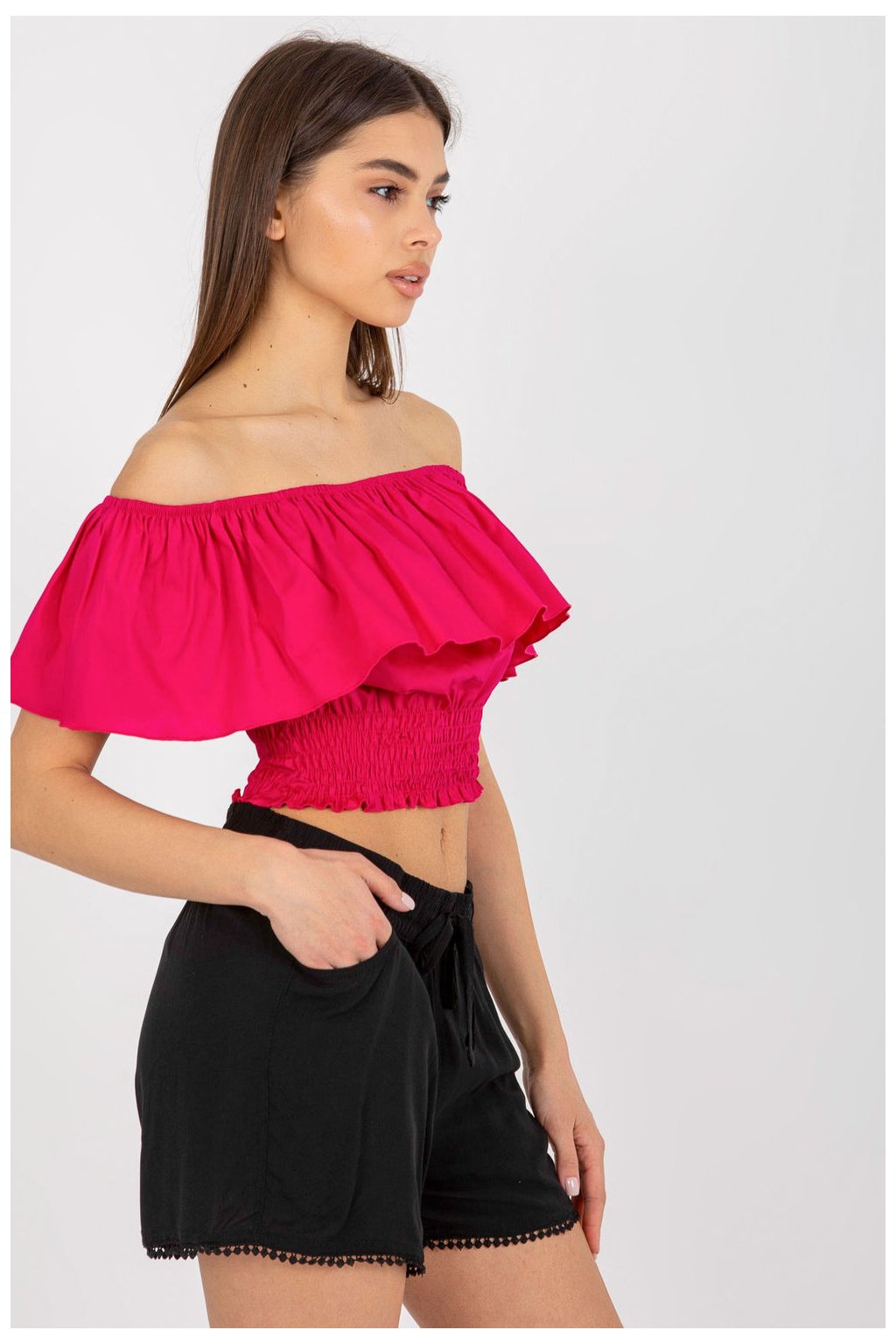 Krátký, každodenní top v boho stylu, vyrobený z měkké bavlny s příměsí elastanu, poskytuje pohodlí a lehkost po celý den. Model bez rukávů s ženským výstřihem typu španělské ozdobený širokou volánkou zdůrazňuje romantický charakter stylizace. Hladká tkanina v přírodním odstínu skvěle ladí s každodenními letními outfity. Bez zapínání je top snadno obléknutelný a jemné ruchy na spodním lemě mu dodávají vzdušný, lehce přiléhavý tvar. Ideální k šortkám, sukním nebo džínům na volné slunečné dny.