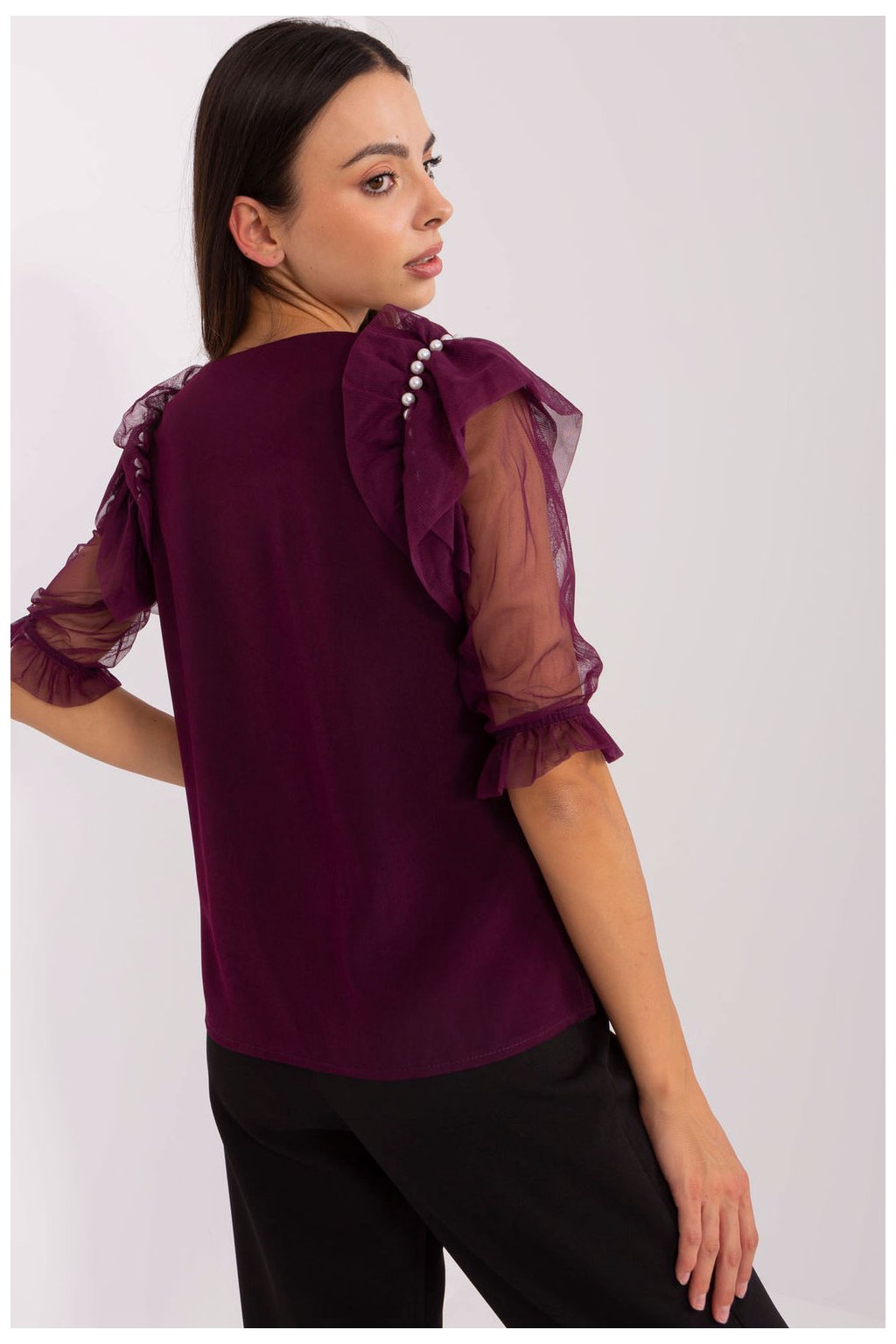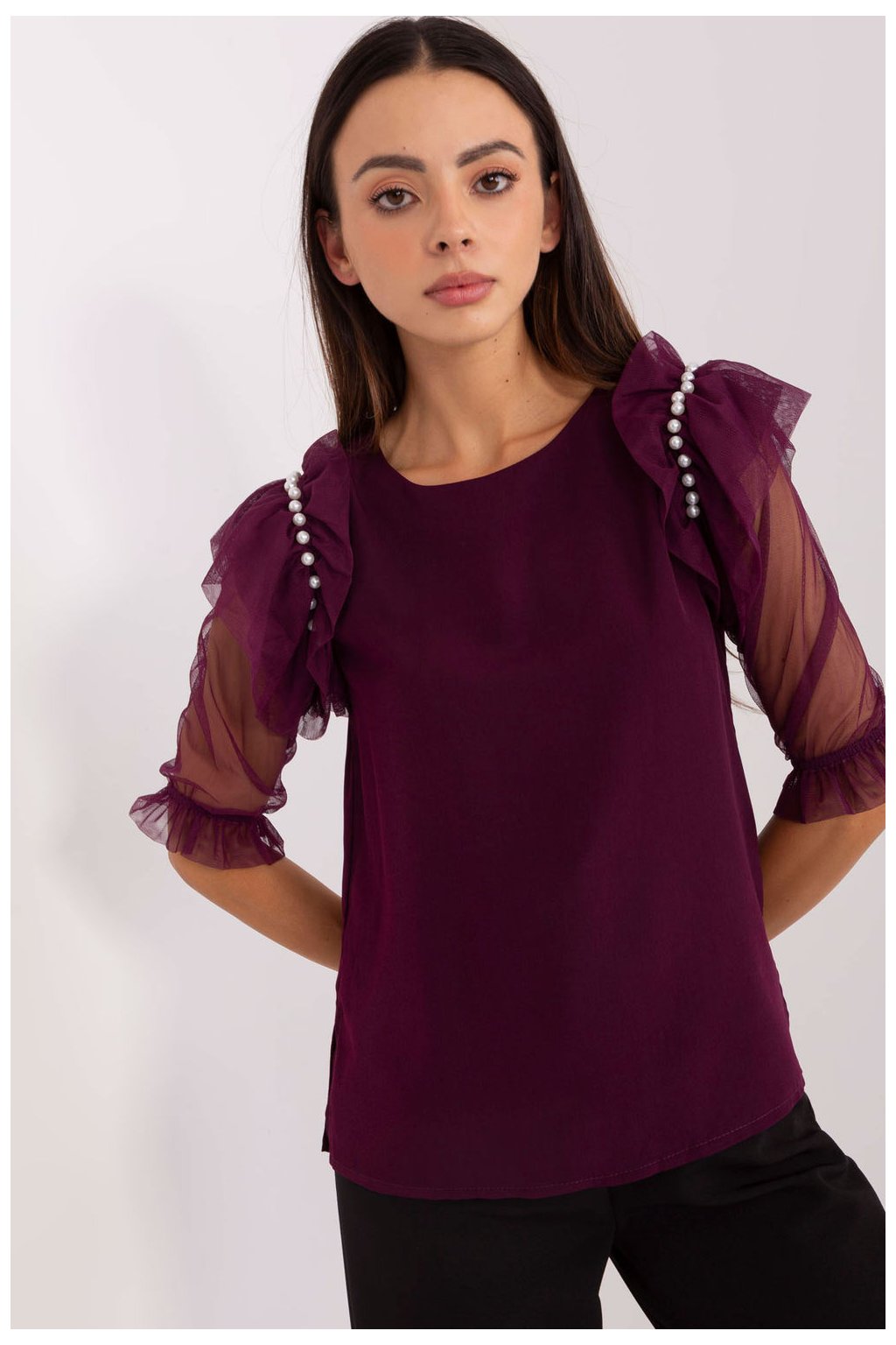 Elegantní blůza standardní délky, vyrobená z kombinace bavlny, elastanu a polyesteru, spojující pohodlí nošení s elegantním vzhledem. Hladká tkanina poskytuje ideální pozadí pro jemné ozdobné korálky umístěné na ramenech, které dodávají celku jedinečný charakter. Model s 3/4 rukávem z jemné síťoviny dodává lehkost a ženský šarm, zatímco klasický kulatý výstřih zdůrazňuje elegantní jednoduchost střihu. Skvělá na společenské události a do práce, v kombinaci jak s elegantními kalhoty, tak s sukní.