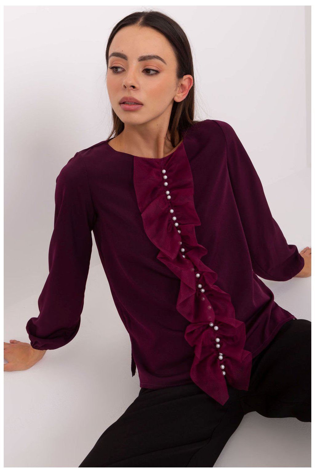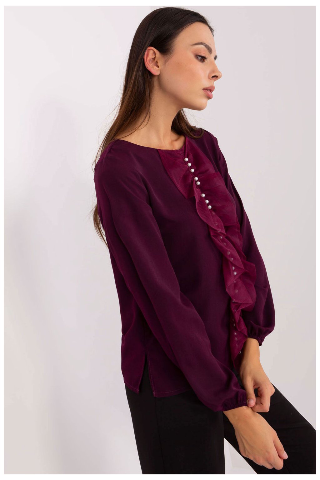 Elegantní blůza standardní délky vyrobena z kombinace polyesteru, viskózy a elastanu poskytuje pohodlí a bezchybný vzhled po celý den. Hladká látka zdůrazňuje rafinovaný charakter modelu, a vertikální volán na přední straně ozdobený drobnými korálky dodává jemný lesk a originalitu. Klasický kulatý výstřih a dlouhý rukáv udělují blůze univerzální, elegantní charakter. Bez zapínání je model pohodlný při oblékání. Ideální jak do práce, tak na elegantní setkání.
