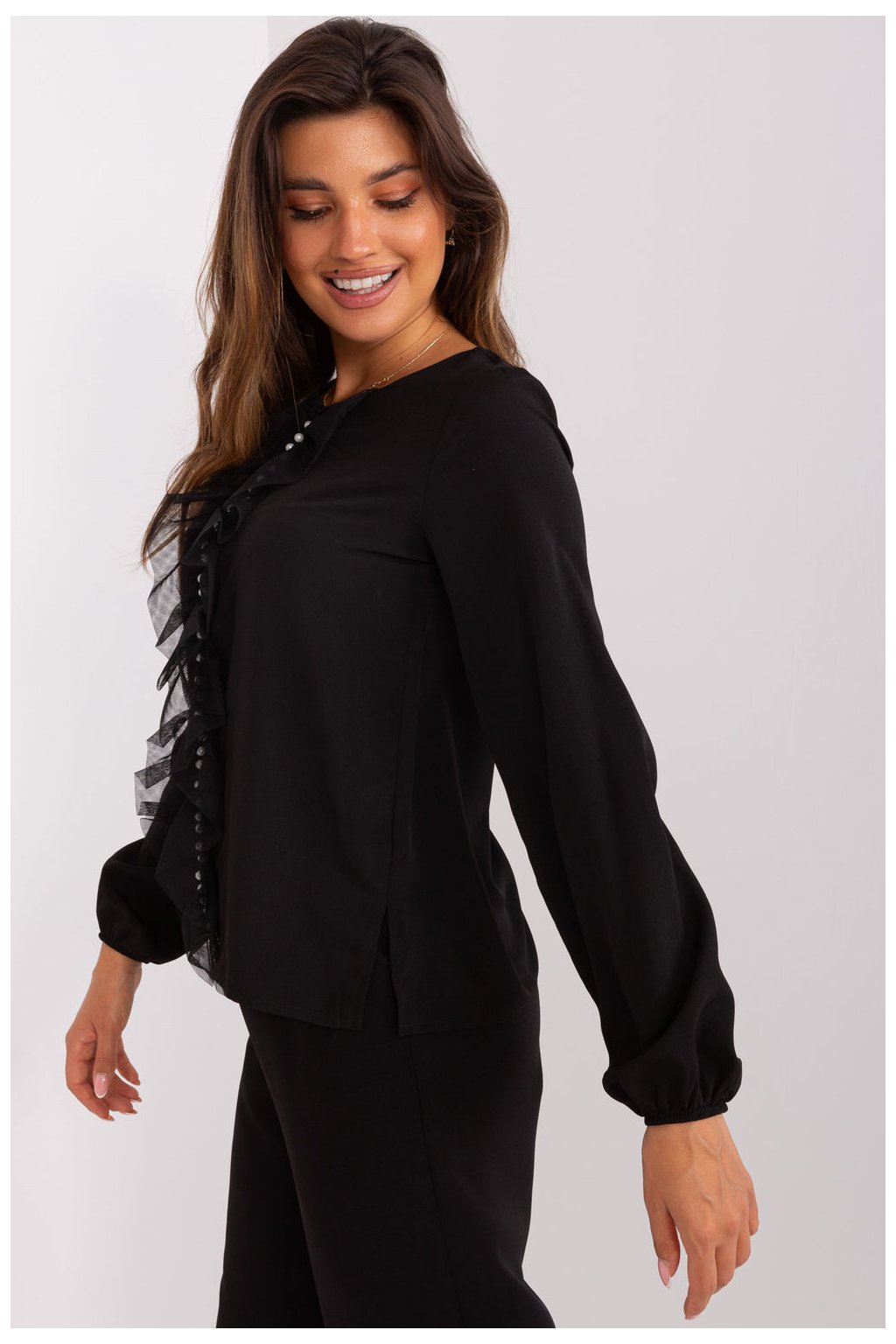 Elegantní blůza standardní délky vyrobená z kombinace polyesteru, viskózy a elastanu, která poskytuje pohodlí a bezchybný vzhled po celý den. Hladká látka zdůrazňuje rafinovaný charakter modelu, zatímco vertikální volán na přední straně zdobený drobnými korálky přidává jemný lesk a originalitu. Klasický kulatý výstřih a dlouhý rukáv dávají blůze univerzální, elegantní charakter. Bez zapínání je model pohodlný na nošení. Ideální jak do práce, tak na elegantní setkání.