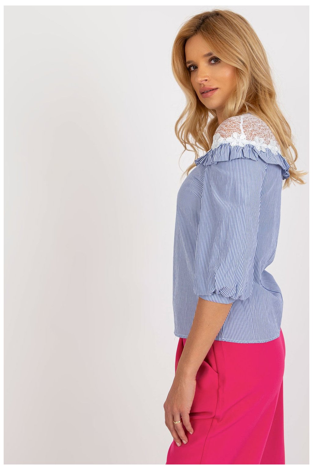 Elegantní blůza standardní délky vyrobená z přírodní bavlny, kombinující klasický pruhovaný vzor s jemnými ženskými detaily. Výstřih zdobí jemná krajková ozdoba a okouzlující volánky, které dodávají celku lehkost a romantický charakter. Nadýchané rukávy 3/4 přinášejí módní akcent a absence zapínání zajišťuje pohodlné nošení. Model skvěle padne jak do práce, tak na formální události, skvěle ladí s elegantními kalhotami nebo sukní.
