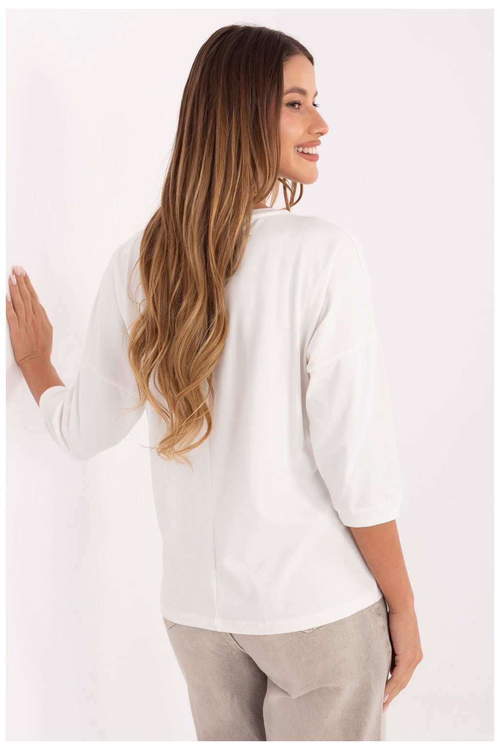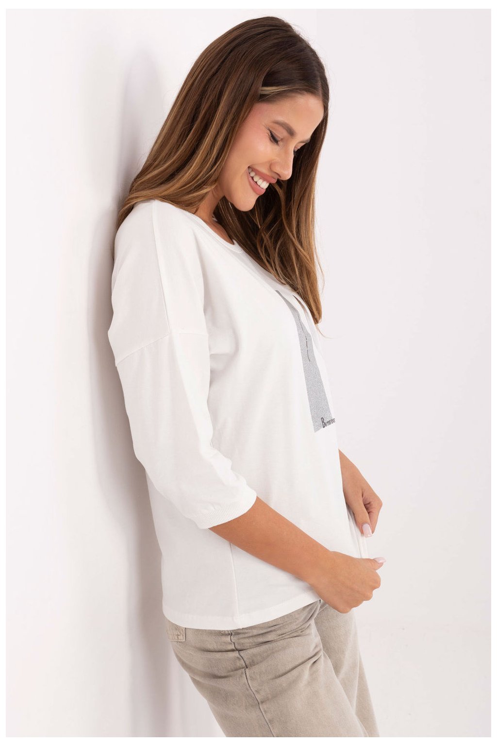 Casual dámský top s metalickým potiskem vpředu je ideální nabídkou na každý den, která dodává outfitu jemný lesk. Vyrobený z měkké bavlny s přídavkem elastanu poskytuje pohodlí a volnost pohybu, a standardní délka umožňuje snadné sladění s oblíbenými kalhotami nebo sukní. Model s 3/4 rukávem a klasickým kulatým výstřihem spojuje pohodlí s módním akcentem, díky čemuž se skvěle hodí jak do každodenních, tak trochu volnějších, příležitostných outfitů.