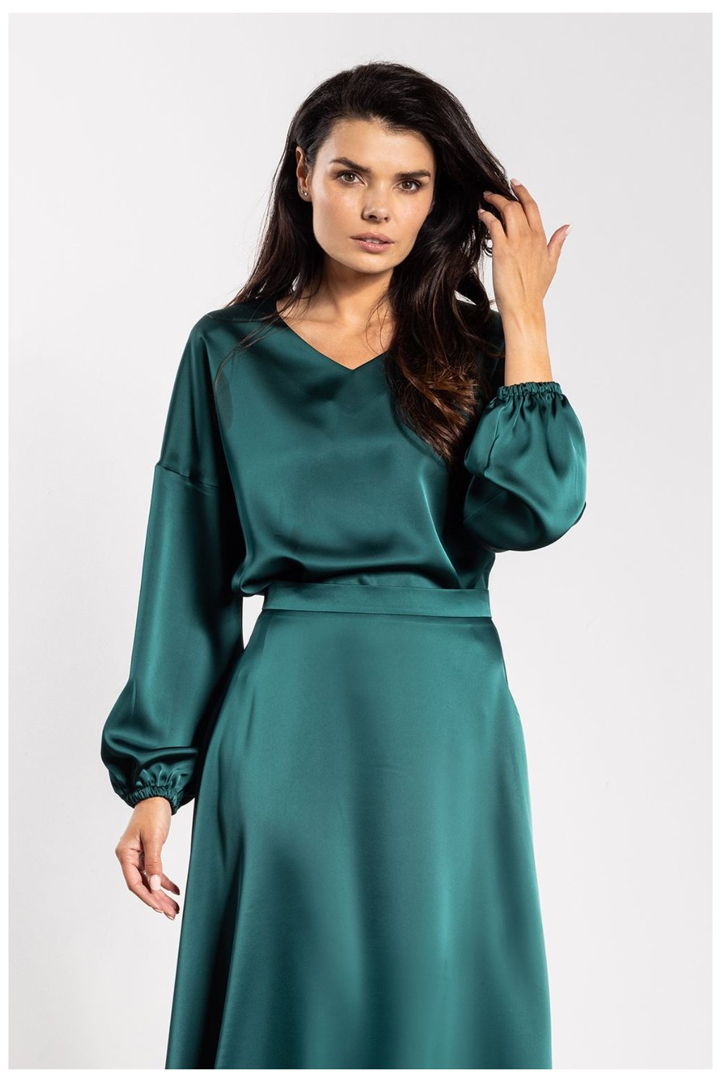 Elegantní saténová halenka s volným střihem spojuje pohodlí s elegancí. Jemný lesk látky jí dělá skvěle vypadat jak na každý den, tak i během speciálních příležitostí. Výstřih ve tvaru písmene V decentně zúží krk a zdůrazní ženskost, zatímco volný střih zaručuje pohodlí nošení. Dlouhé rukávy s decentním mašlováním u manžety dodávají celku lehkosti a eleganci.