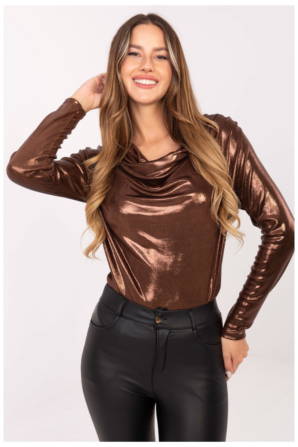 Elegantní blůzka s rafinovaným charakterem, ideální na návštěvy a večírky. Vyrobená z lesklého materiálu z polyesteru a viskózy, který přitahuje pohled a dodává outfitu jiskru. Blůzka má rozmanitou strukturu materiálu, co jí dává výjimečný vzhled. Má dlouhý rukáv a přeplňující výstřih, který se krásně usazuje na postavě, dodávající celku lehkost a eleganci. Dekorativní záhyby na materiálu přinášejí další prvek šiku, zdůrazňující její původní design. Standardní délka dělá z blůzky skvělý doplněk k různým outfitům.