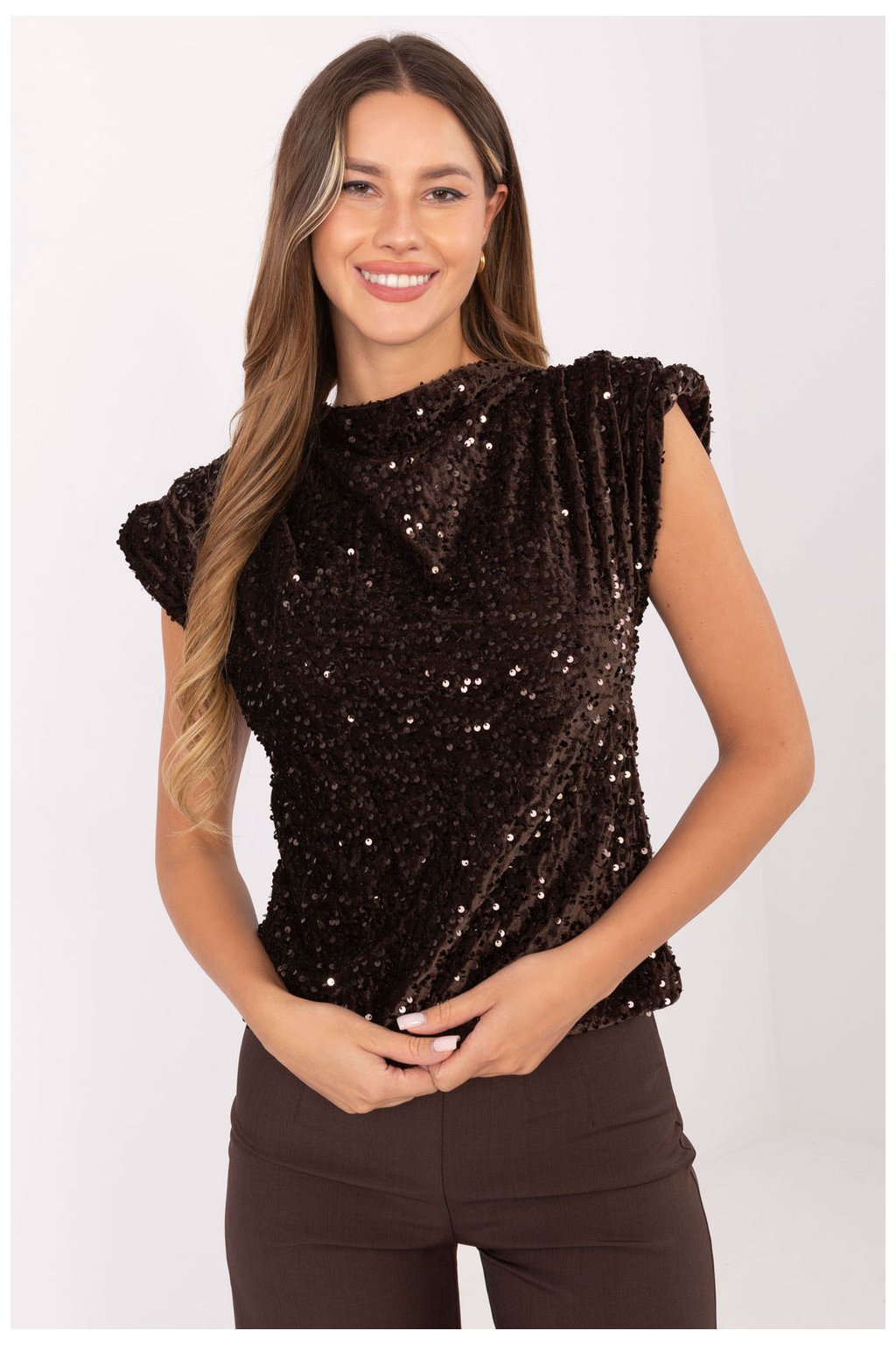 Oslnivý top s elegantním charakterem je skvělou volbou na speciální příležitosti a večerní vycházky. Vyrobený z vysoce kvalitní směsi viskózy a polyesteru, má podšívku, která zajistí pohodlí při nošení a dokonalé uspořádání materiálu. Celá plocha topu je pokrytá lesklými flitry, díky čemuž model efektně září ve světle a přitahuje pohledy. Všité polštářky na ramenou dodávají siluetě moderní, výrazný tvar a zdůrazňují linii ramen. Top má kulatý výstřih, standardní délku a je bez rukávů, což z něj činí ideální volbu na společenské události, elegantní večírky nebo akce.