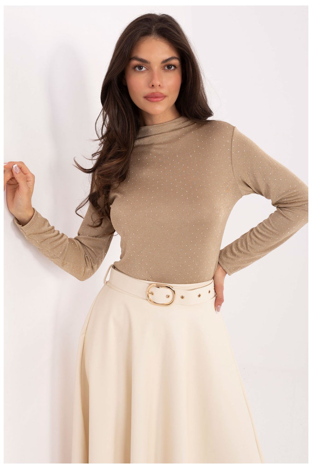 Tato elegantní dámská blůza je nabídkou pro ženy, které ocení styl a decentní lesk na každé společenské události nebo večírku. Model je přizpůsobený, má standardní délku, dlouhý rukáv a klasický rolák, co mu dodává elegantní charakter. Vyrobená z měkké směsi viskózy a polyesteru, blůza je příjemná na dotek, elastická a pohodlná na nošení. Celou plochu zdobí ozdobné flitry, které přidávají jemný lesk a jedinečný půvab každému outfitu. Bez zapínání je blůza praktická a snadno se nasazuje, a její klasický střih umožňuje kombinaci s různými sukněmi, kalhotami nebo elegantními kalhotami na události.