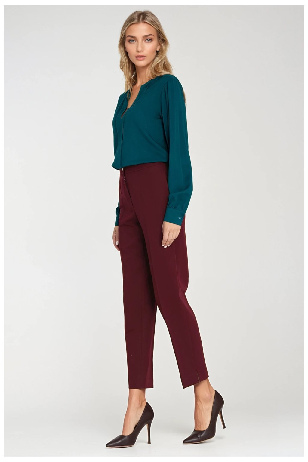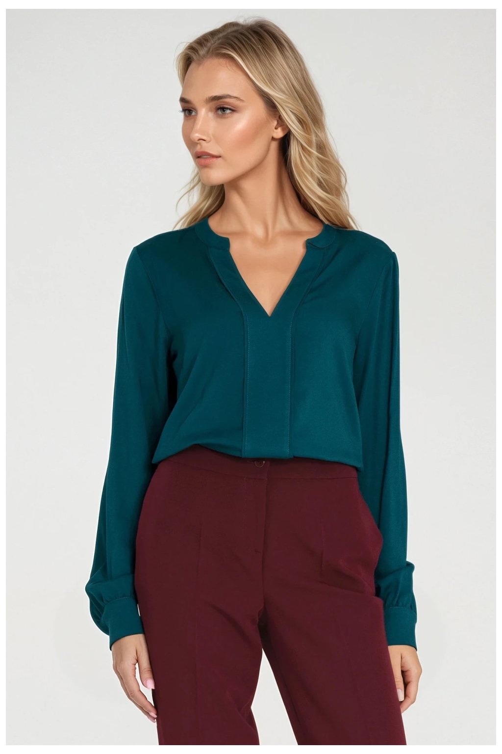 Klasická dámská blůza s pravidelným střihem ušitá z lehké a prodyšné viskózy. Model má výstřih ve tvaru písmene V s širokou plisovanou látkou, která opticky zúží postavu a dodá eleganci. Blůza má dlouhé rukávy s manžetami a nasazuje se přes hlavu, což zajišťuje pohodlí při nošení. Jednoduchý, nadčasový střih se skvěle hodí jak do každodenních, tak do pracovních stylizací.