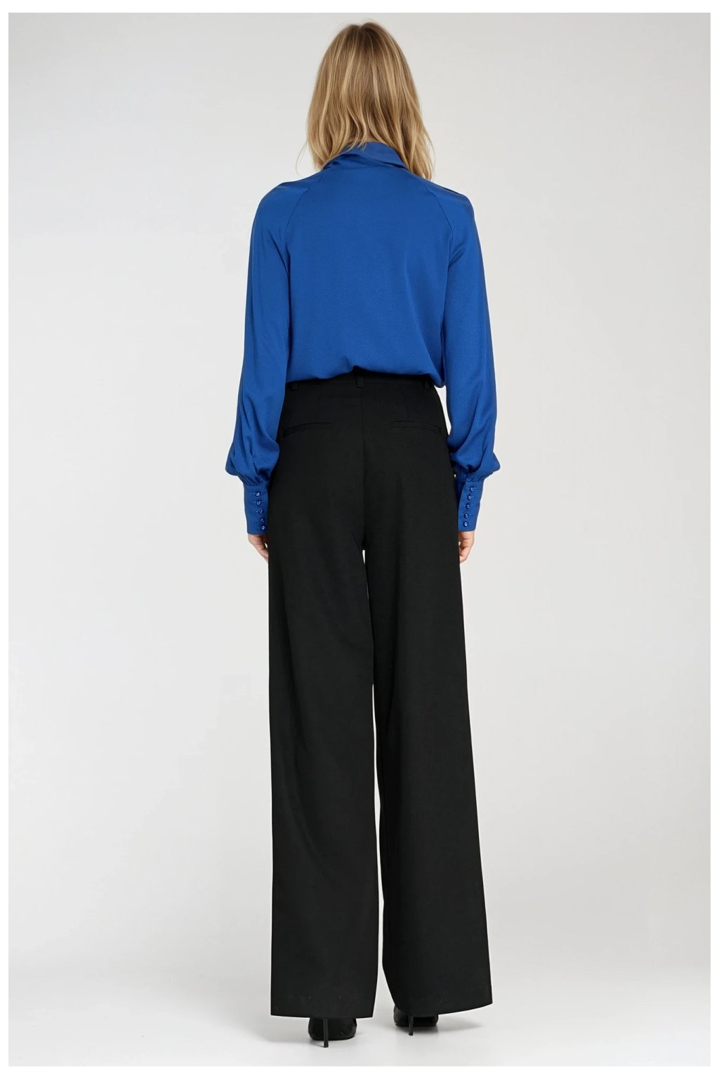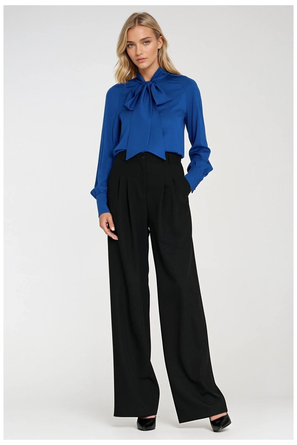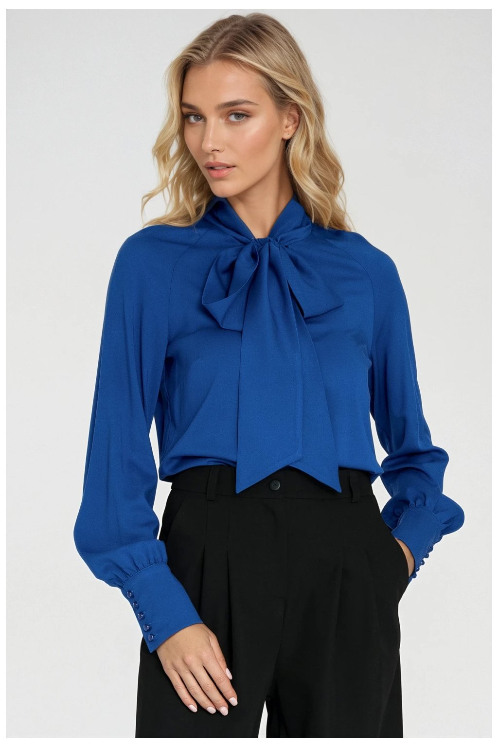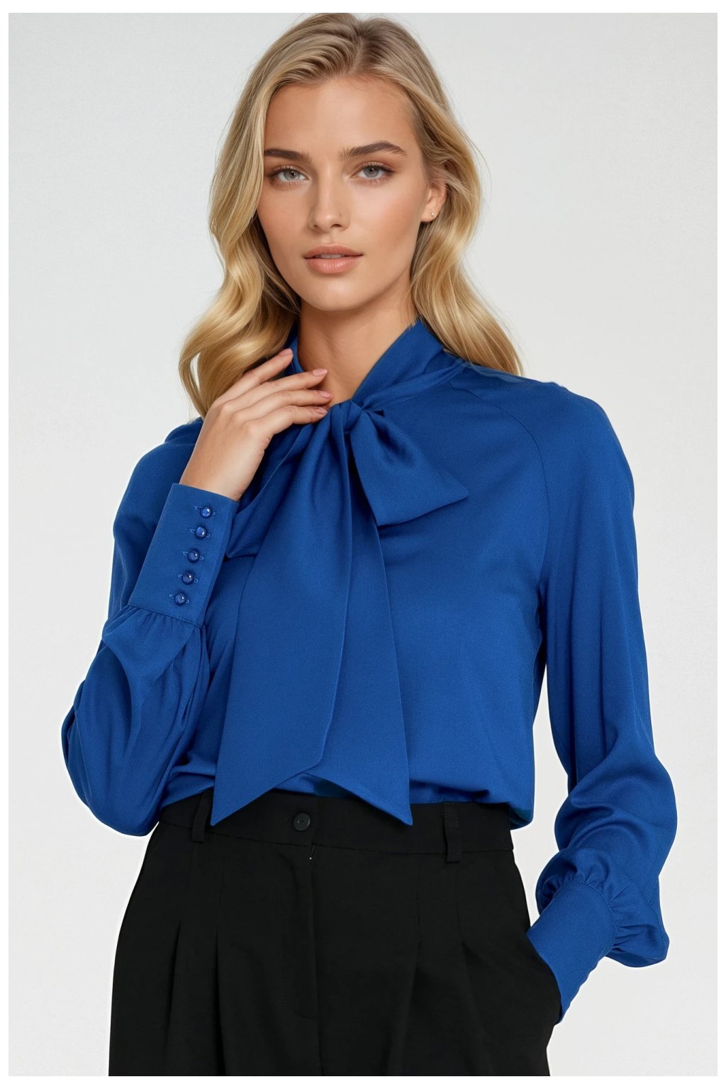 Elegantní dámská blůza s pravidelným střihem vyrobená z jemné, příjemné viskózy na dotek. Model má dlouhý rukáv zakončený širokým manžetou s ozdobnými knoflíky, který dodává celku jemnou eleganci. Blůza se obléká přes hlavu a vyniká širokým šátkem k libovolnému uvázání kolem krku, můžete jej uvázat do mašle, nechat volně viset nebo obvázat kolem krku, vytvářejíc různé stylizace. Jedná se o univerzální kus oblečení, ideální jak do práce, tak na speciální příležitosti.