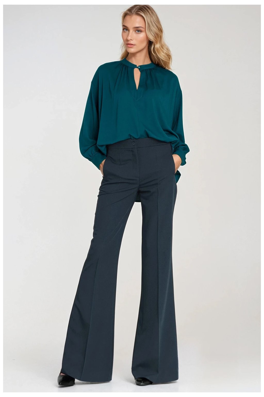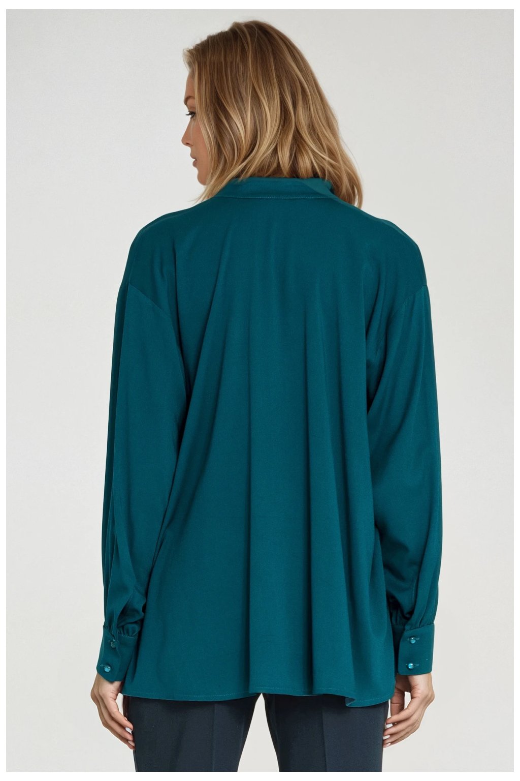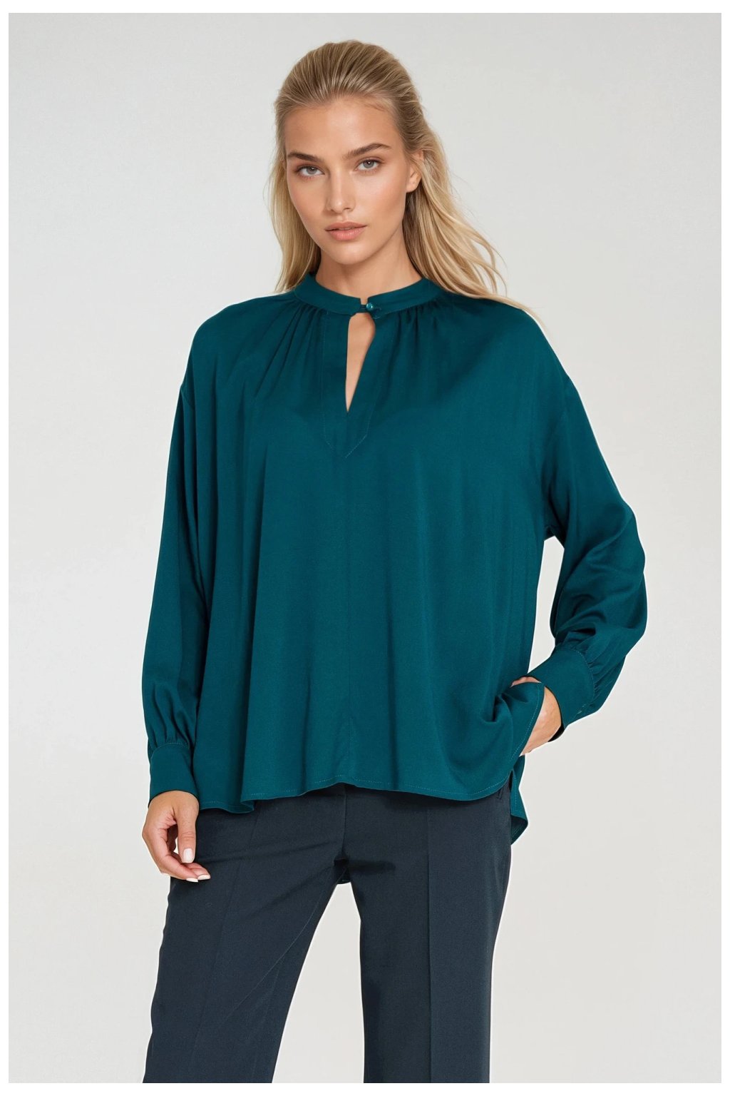 Elegantní blůza volného střihu oversize, vyrobena z lehké a příjemné viskózy, která zajišťuje pohodlí po celý den. Model s výstřihem ve tvaru slzky se zapínáním na knoflík jemně zdůrazňuje krk a dodává ženské kouzlo. Blůza má dlouhé rukávy se zakončením na manžetách a jemné rimplování u výstřihu a manžet, které jí dodávají lehkost a elegantní charakter. Univerzální model, který se skvěle hodí jak do kancelářských, tak do volnočasových stylizací.