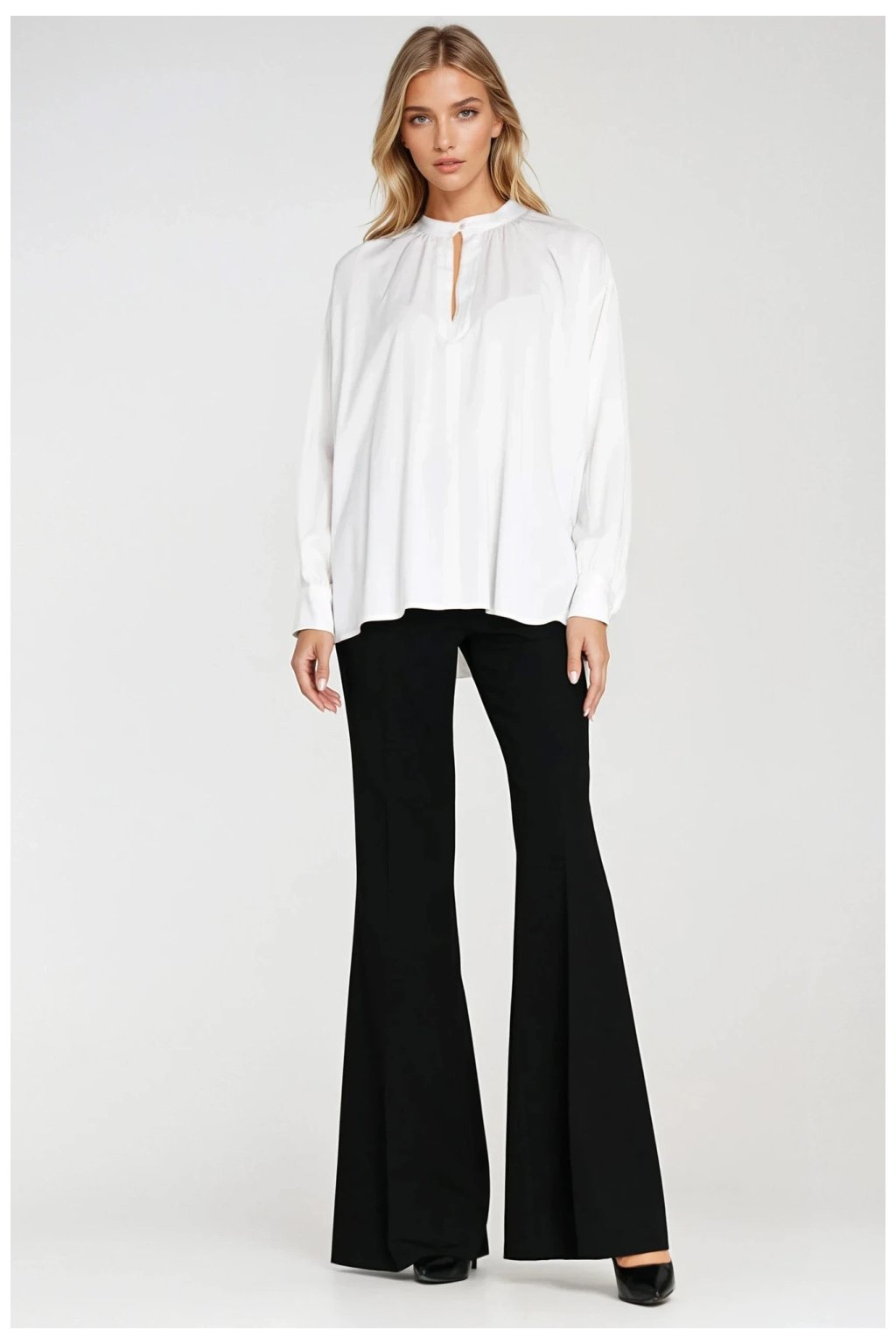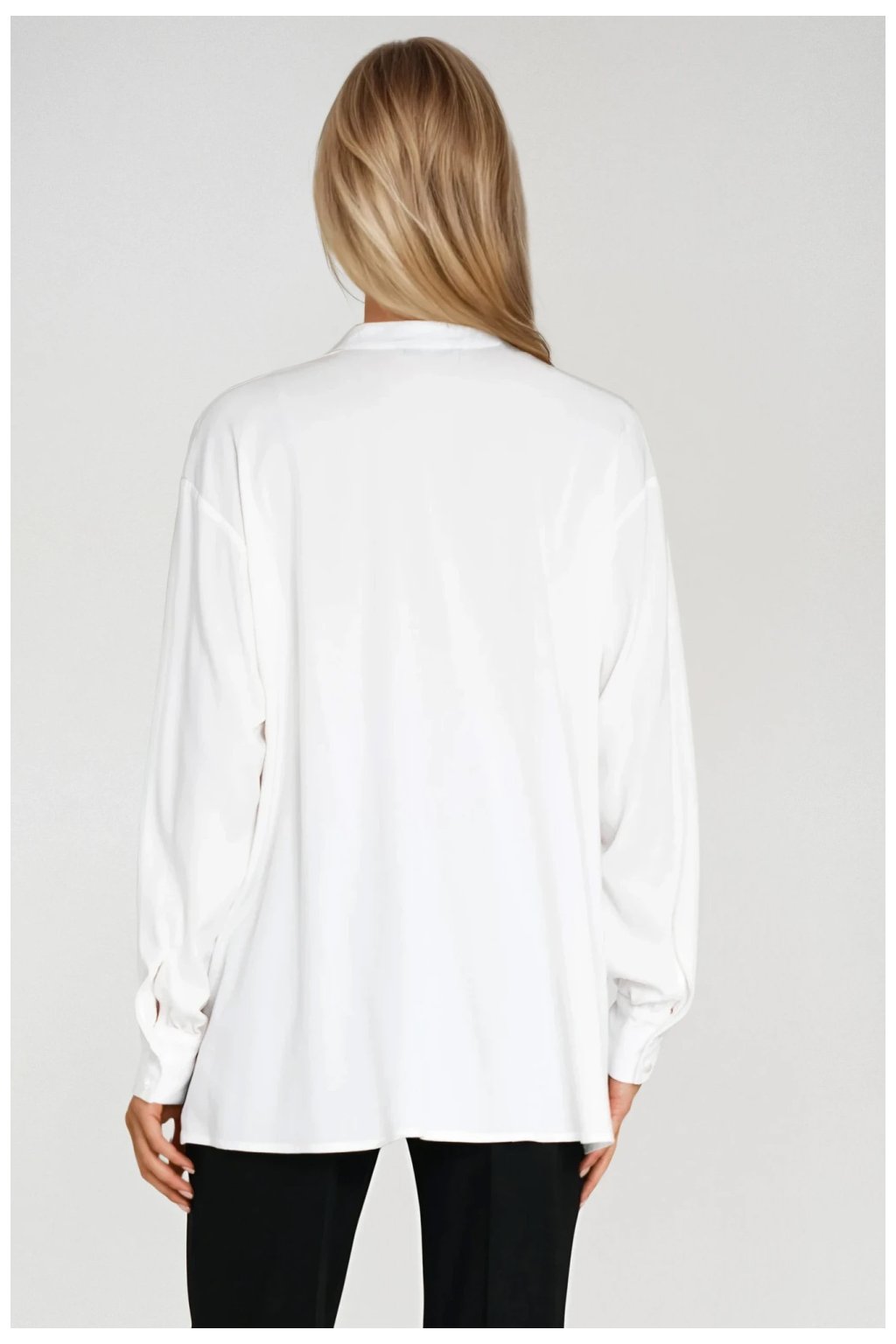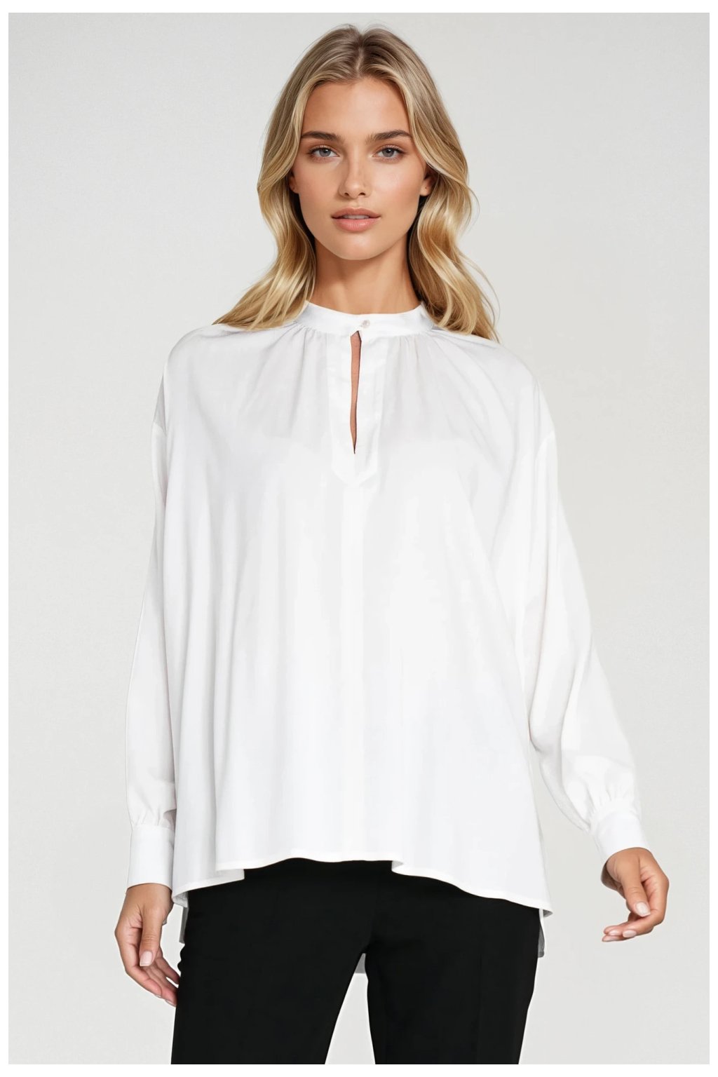 Elegantní blůzka s volným střihem oversize, vyrobena z lehké a příjemné viskózy, která poskytuje pohodlí po celý den. Model s výstřihem ve tvaru slzky zapínáním na knoflík jemně zdůrazňuje krk a dodává ženské kouzlo. Blůzka má dlouhé rukávy zakončené manžetami a jemnými záhyby u výstřihu a manžet, které jí dodávají lehkost a elegantní charakter. Univerzální model, který se skvěle hodí jak do kancelářských, tak do každodenních outfitů.