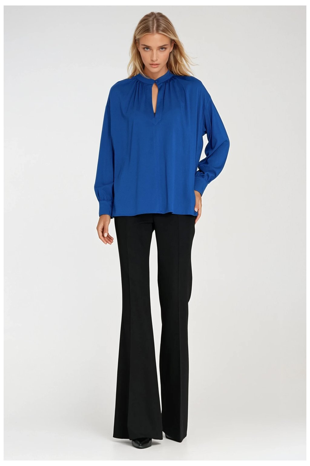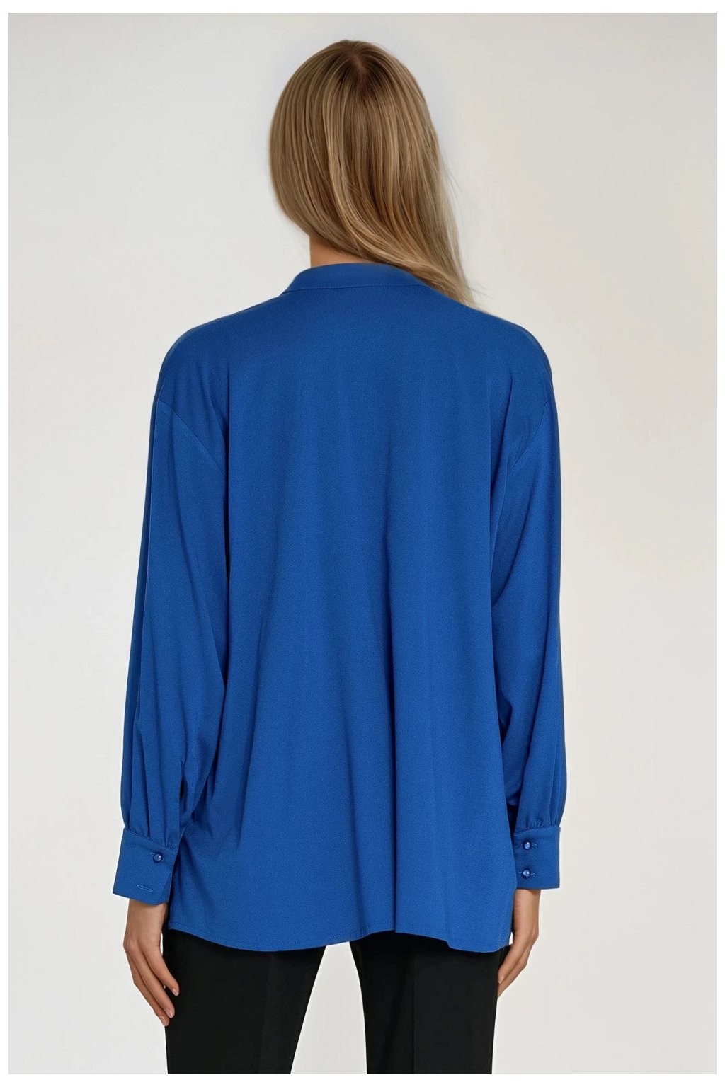 Elegantní blůza volného střihu oversize, vyrobena z lehké a příjemné viskózy, která poskytuje pohodlí po celý den. Model s výstřihem ve tvaru slzičky s knoflíkem jemně zdůrazňuje krk a dodává ženské kouzlo. Blůza má dlouhé rukávy se zakončením manžetami a jemné začištění u výstřihu a manžet, které jí dodávají lehkost a elegantní charakter. Univerzální model, který se skvěle hodí jak do kancelářských, tak volnočasových stylizací.