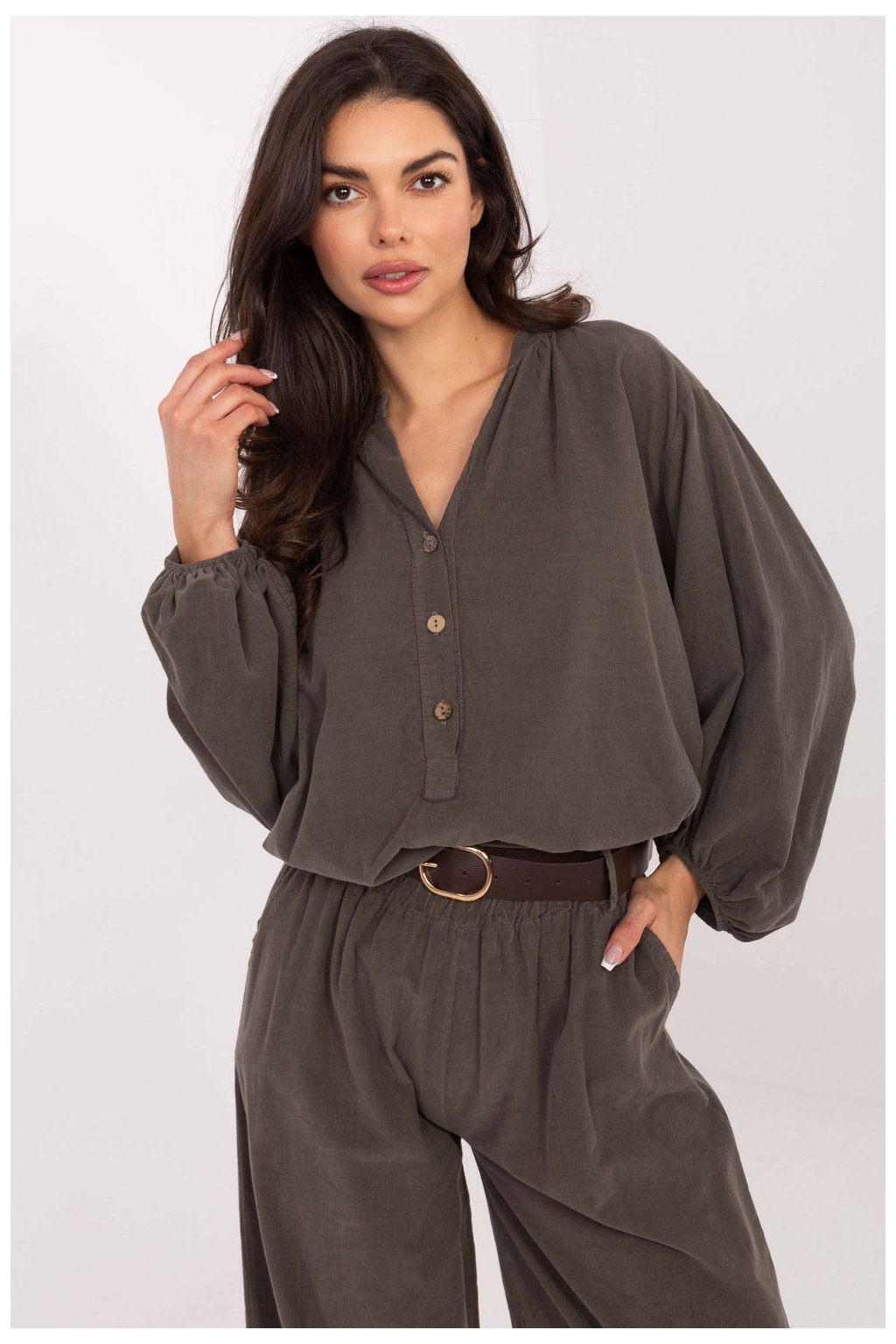 Elegantní košilová blůza v casual stylu, ideální na každý den. Vyrobená z lehkého a příjemného polyesteru, poskytuje pohodlí po celý den. Model má dlouhé nadýchané rukávy, které přidávají jemnou lehkost a ženský charakter. Výstřih ve tvaru srdce s jemným stojáčkem krásně zdůrazňuje krk, a zapínání na knoflíky do poloviny délky usnadňuje oblékání a dodává celku elegantní dokončení. Blůza v hladké, jednobarevné barvě s standardní délkou skvěle ladí jak s džíny, tak s sukněmi, vytvářející každodenní, módní vzhled.