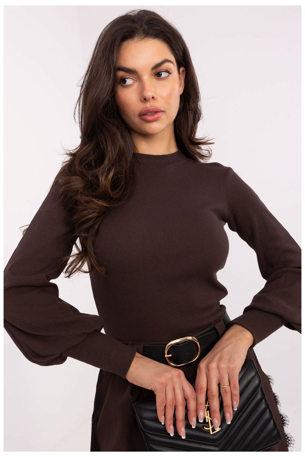 Elegantní a pohodlný top z pruhované látky je klasika, která se hodí do každodenního outfitu. Vyrobený z elastické směsi bavlny a elastanu, skvěle se přizpůsobuje postavě, poskytující pohodlí po celý den. Model má polo rolák, který jemně zdůrazňuje krk a dodává celku elegantní charakter. Dlouhé rukávy s širokým manžetou přidávají topu moderní vzhled a lehkou originalitu. Díky hladké struktuře a standardní délce se top skvěle kombinuje jak s kalhotami, tak s sukní, ideální na každý den, do práce nebo jako základ pod sako. Bez zapínání je velmi praktický a pohodlný k nošení.