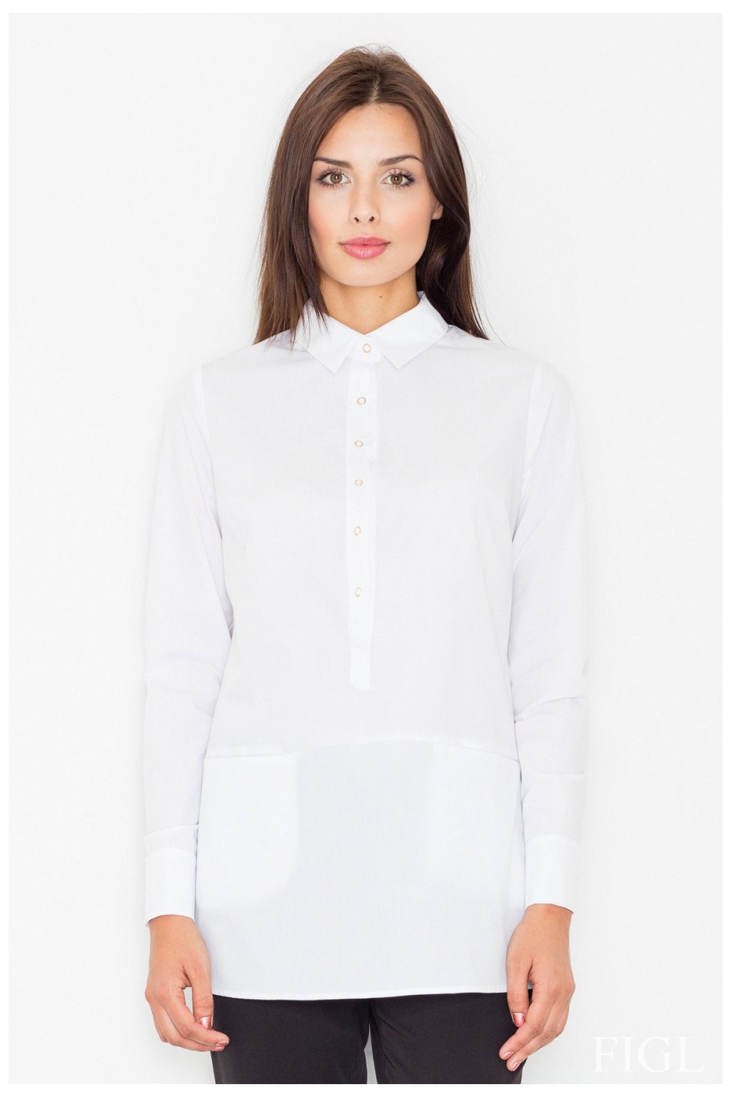 Prodloužená halenka s dlouhými rukávy. Halenka se zapíná uprostřed na 6 knoflíků.