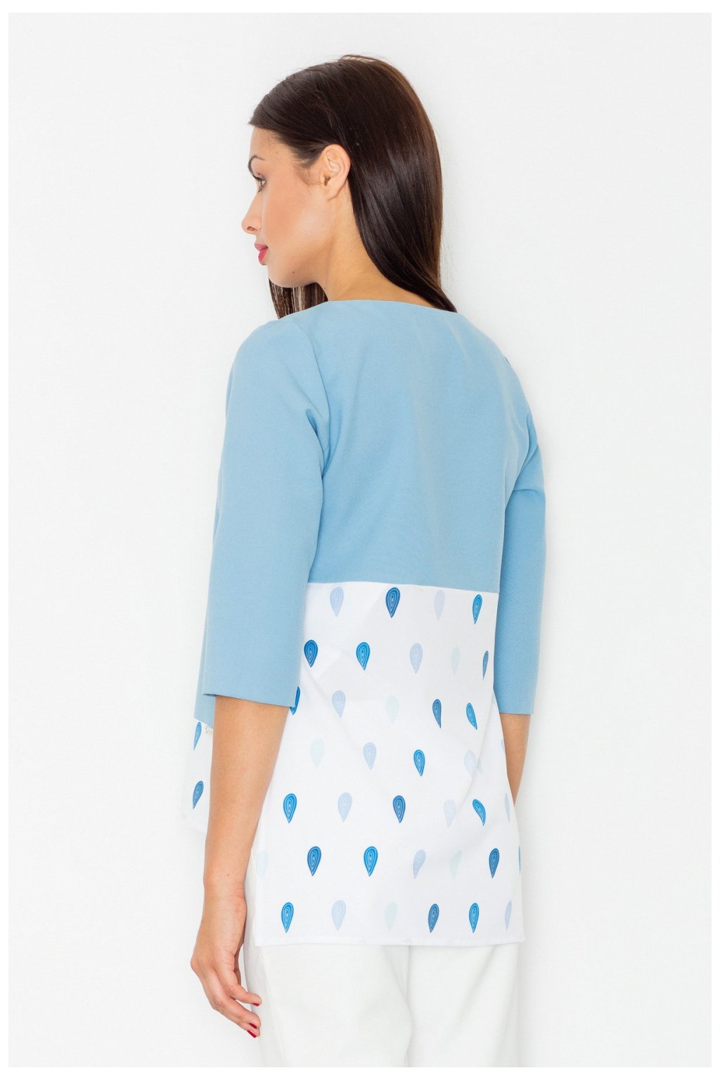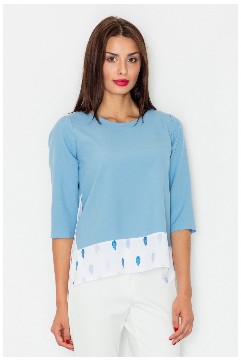 Volná halenka s 3/4 rukávy a zajímavým vzorem ve spodní části. Ideální pro mnoho příležitostí.