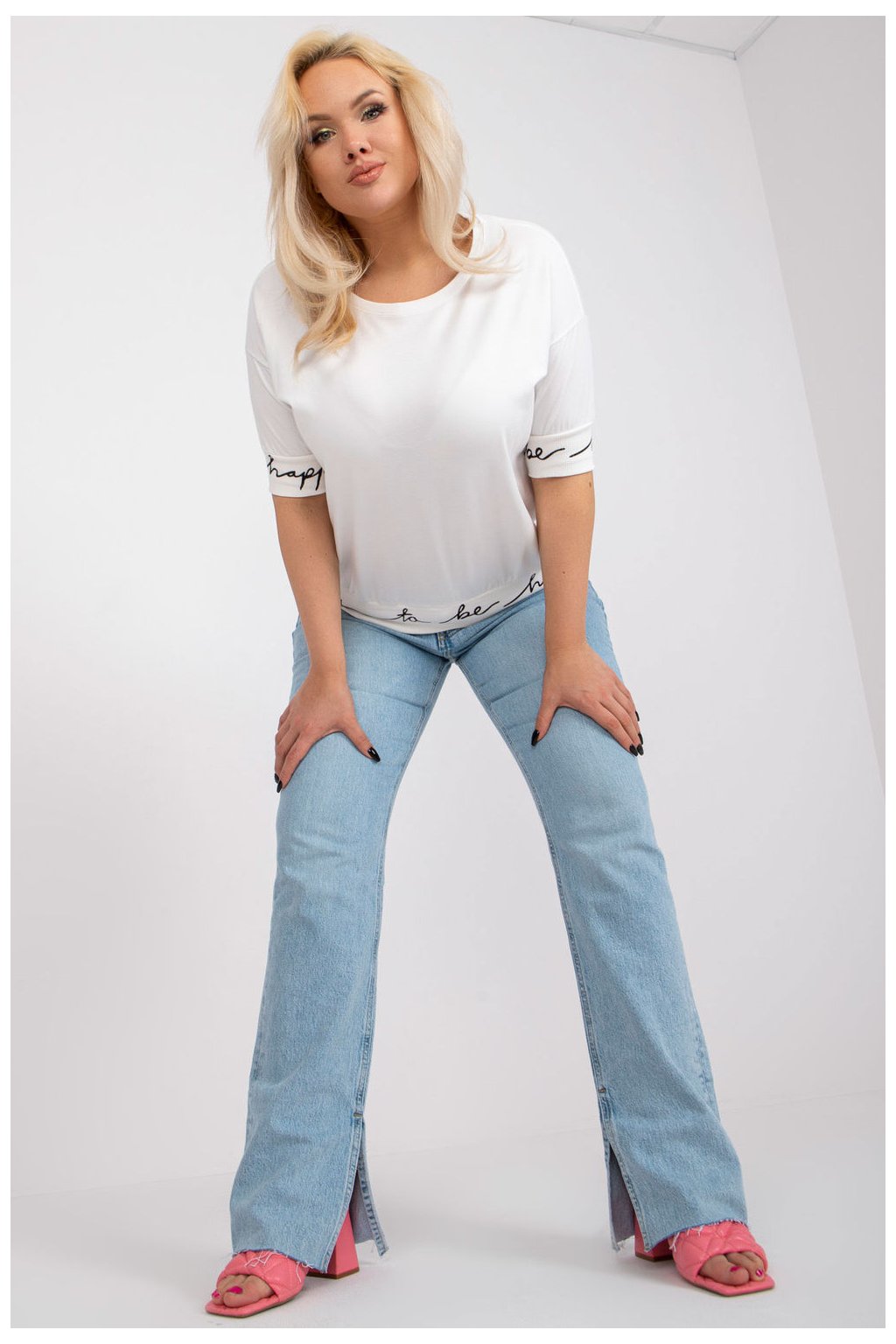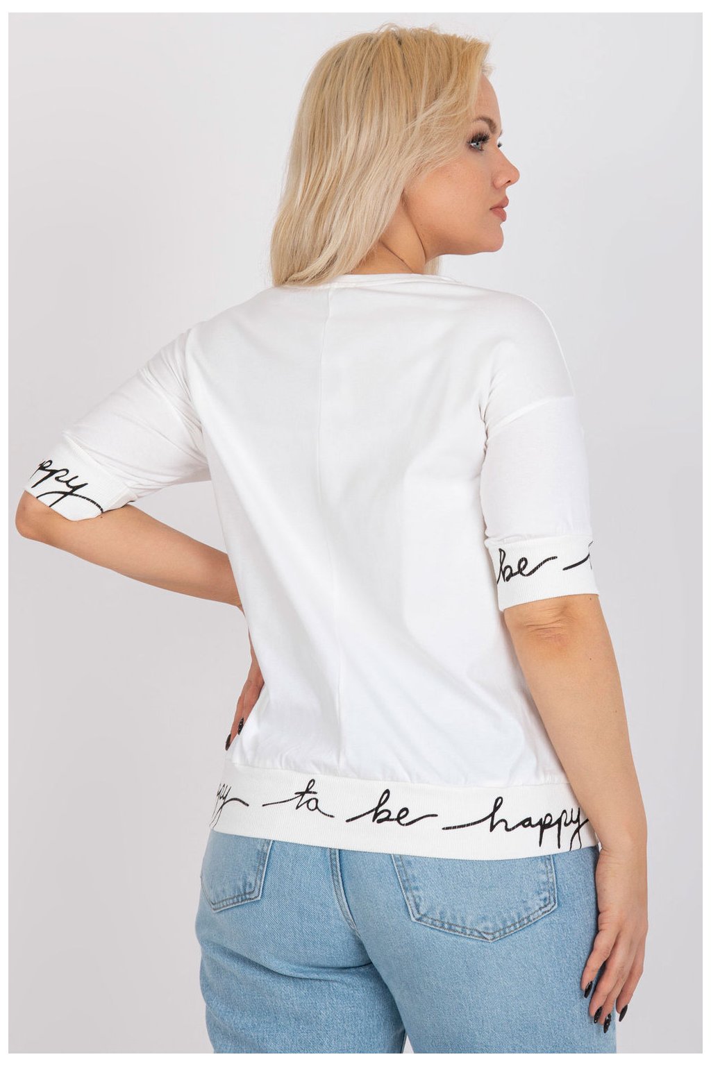 Plus size halenka s krátkými rukávy a kulatým výstřihem. Rukávy a spodní část halenky s ozdobným nápisem.