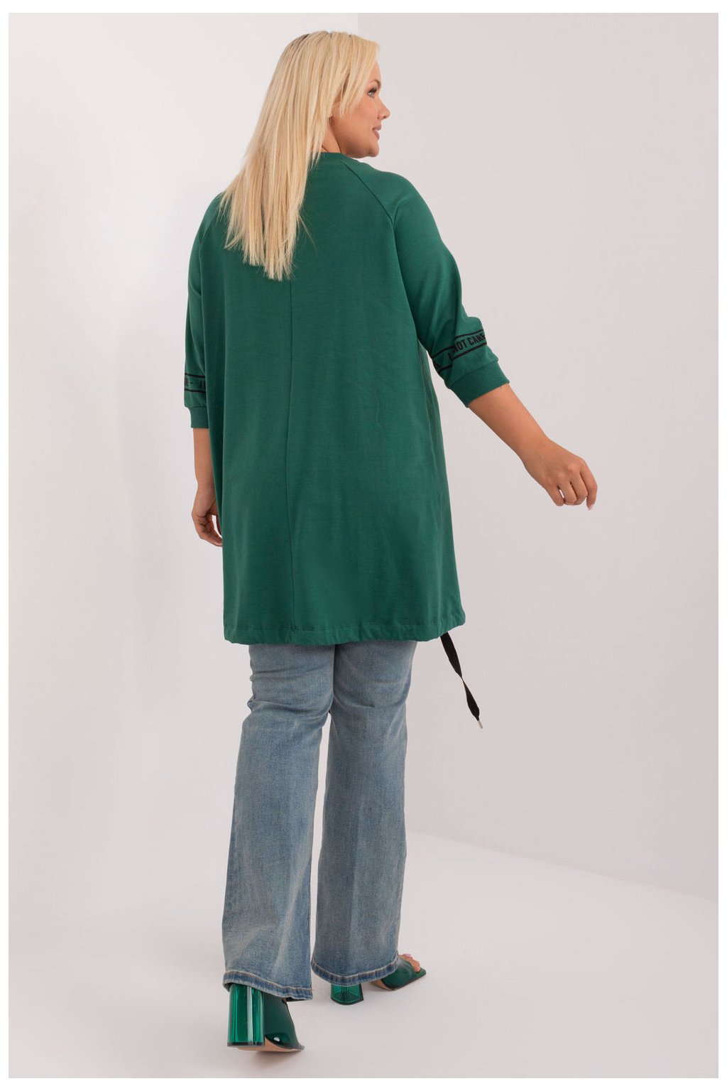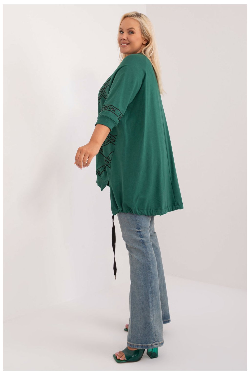Asymetrická halenka plus size je každodenní kousek s jednoduchým, elegantním střihem, ideální pro každodenní nošení. Je vyrobena z bavlny s přídavkem elastanu, což zaručuje pohodlí a lehký střih. Prodloužený střih a 3/4 rukávy zajišťují volnost pohybu a pohodlí. Halenka má kulatý výstřih, který jí dodává klasický vzhled. Na přední straně je nápis zdobený kamínky, který dodává halence módní a originální charakter. Ideální pro každodenní stylizaci, ať už do práce, nebo na běžné vycházky.