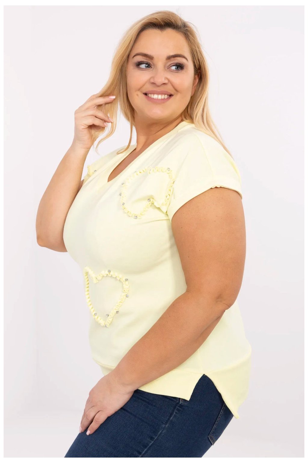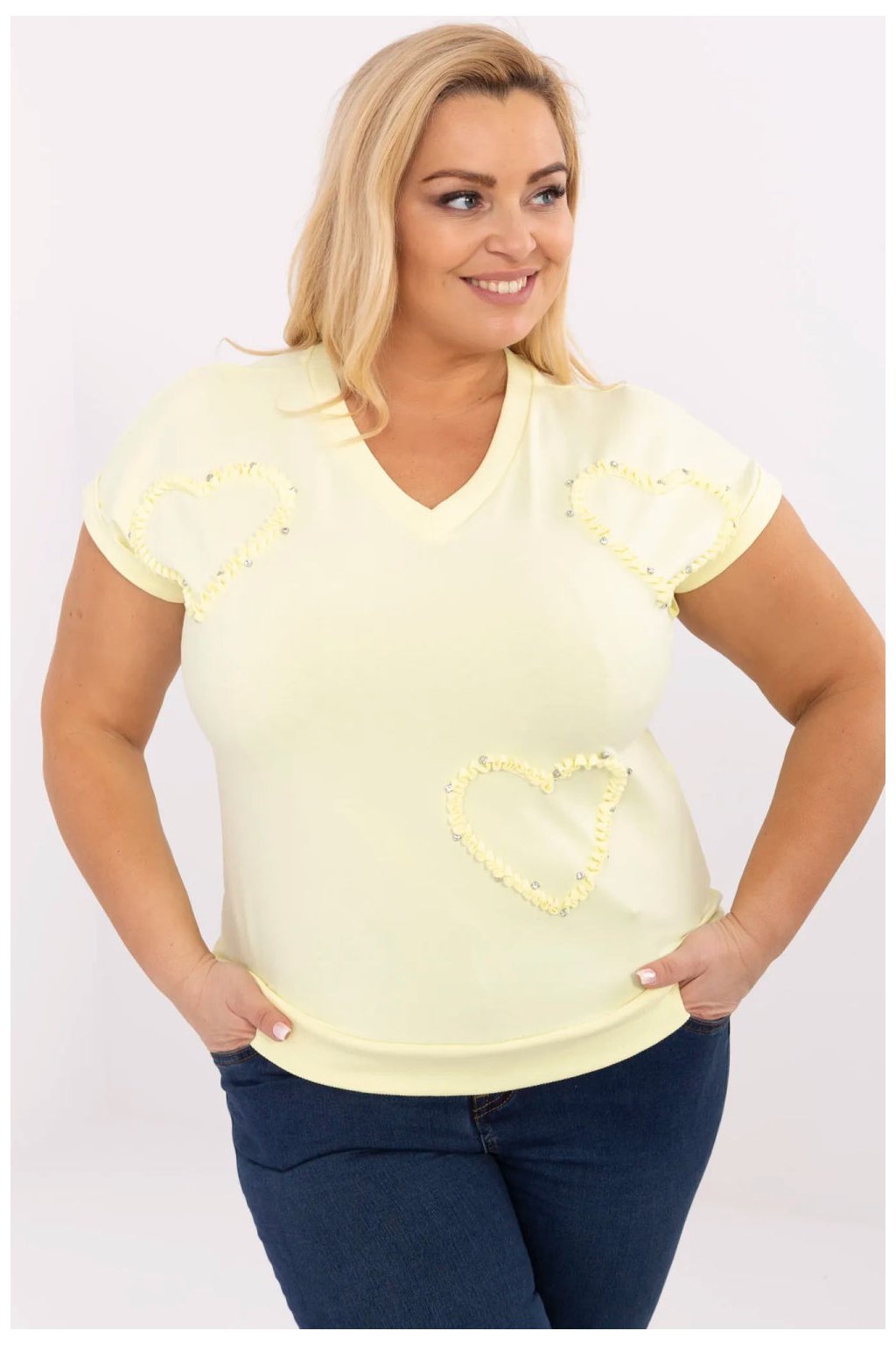 Dámská košile plus size v casual stylu je ideální nabídkou na každý den i do práce. Vyrobená z příjemné bavlny s přídavkem elastanu poskytuje pohodlné nošení a skvěle padne k postavě. Model standardní délky s krátkým rukávem a ženským výstřihem do V, který jemně zdůrazňuje krk. Pozornost přitahuje efektní aplikace na přední straně ve tvaru srdcí zdobená třpytivými zirkony, která košili dodává elegantní a zároveň jemný šarm. Skvělá pro každodenní outfity, hodí se jak s džíny, tak s klasickými kalhotami nebo sukní. Univerzální, pohodlná a s charakterem, ideální do práce i na volnější setkání.