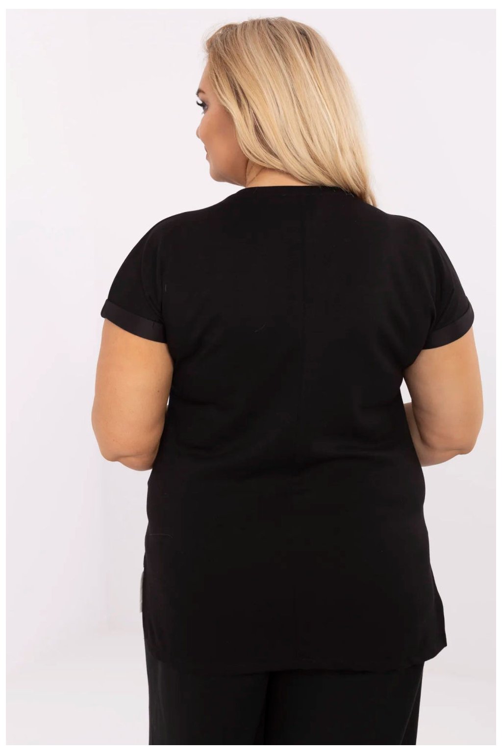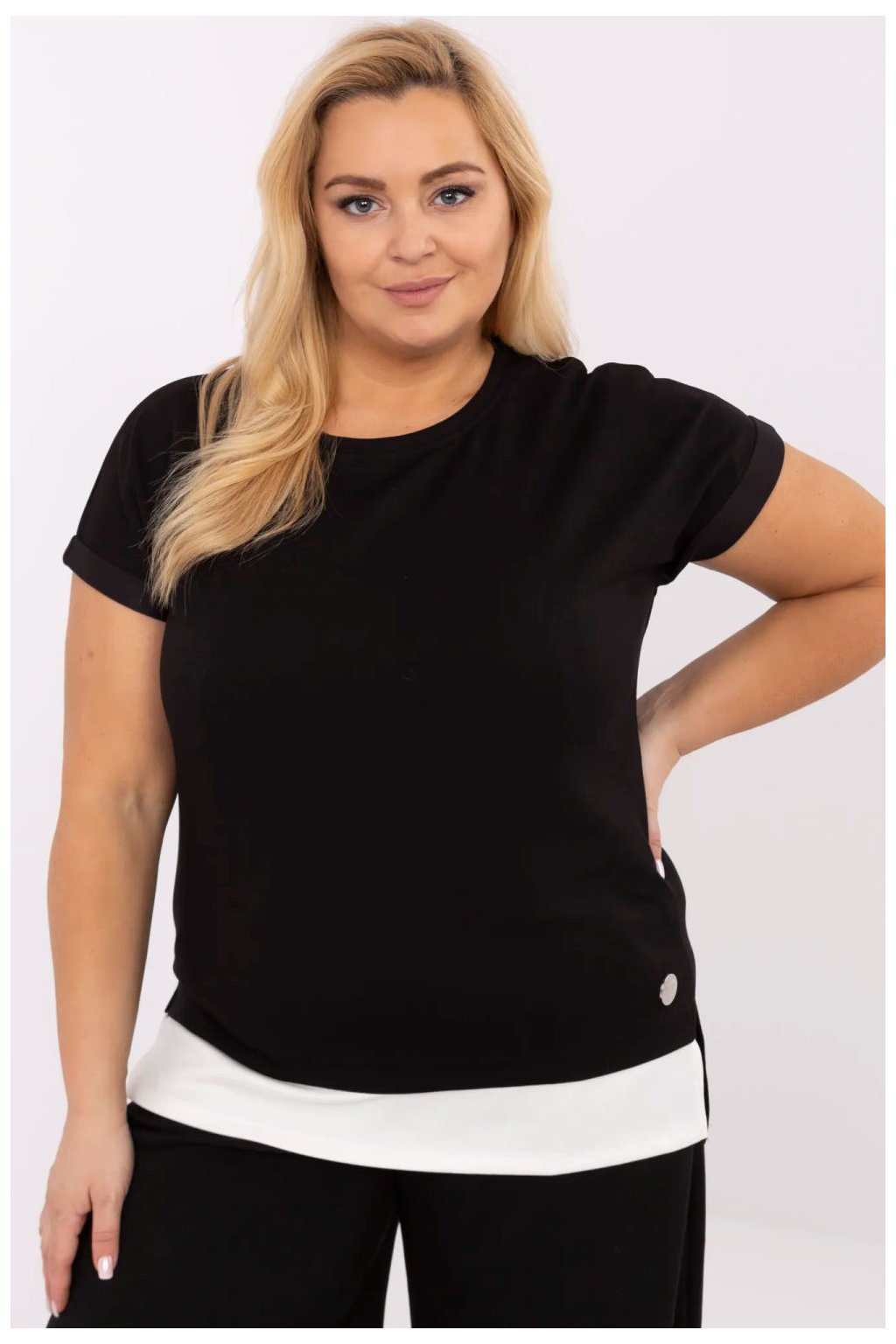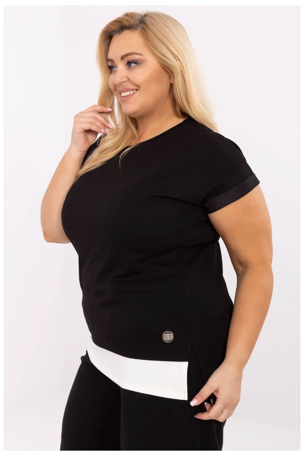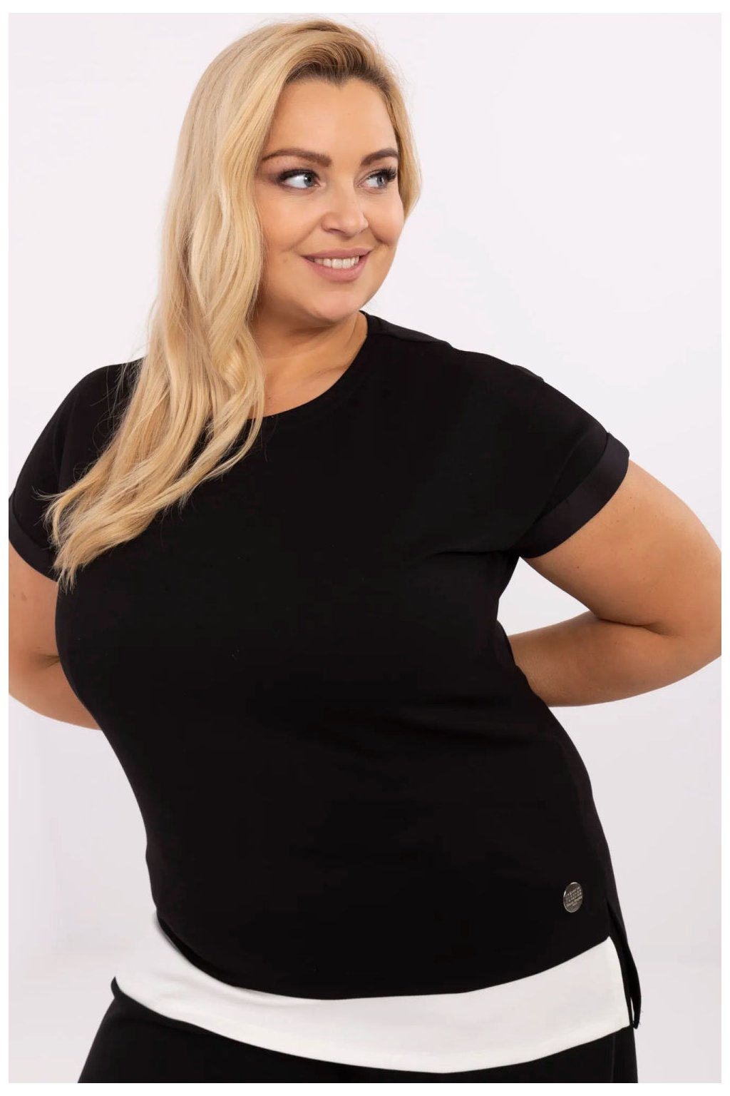 Tento každodenní top plus size je skvělou kombinací pohodlí a ležérního stylu. Vyrobený z velmi měkkého a příjemného materiálu typu "máslo" (viskóza s příměsí elastanu a polyesteru), skvěle padne a poskytuje pohodlí po celý den. Hladká struktura a klasický kulatý výstřih dělají z modelu skvělý doplněk k mnoha stylizacím, standardní délka a krátký rukáv z něj dělají praktickou volbu na každý den. Kontrastní vložka ve spodní části přední části topu přidává moderní dotek a opticky zúžuje postavu. Bez zapínání, snadné na oblékání a nošení.