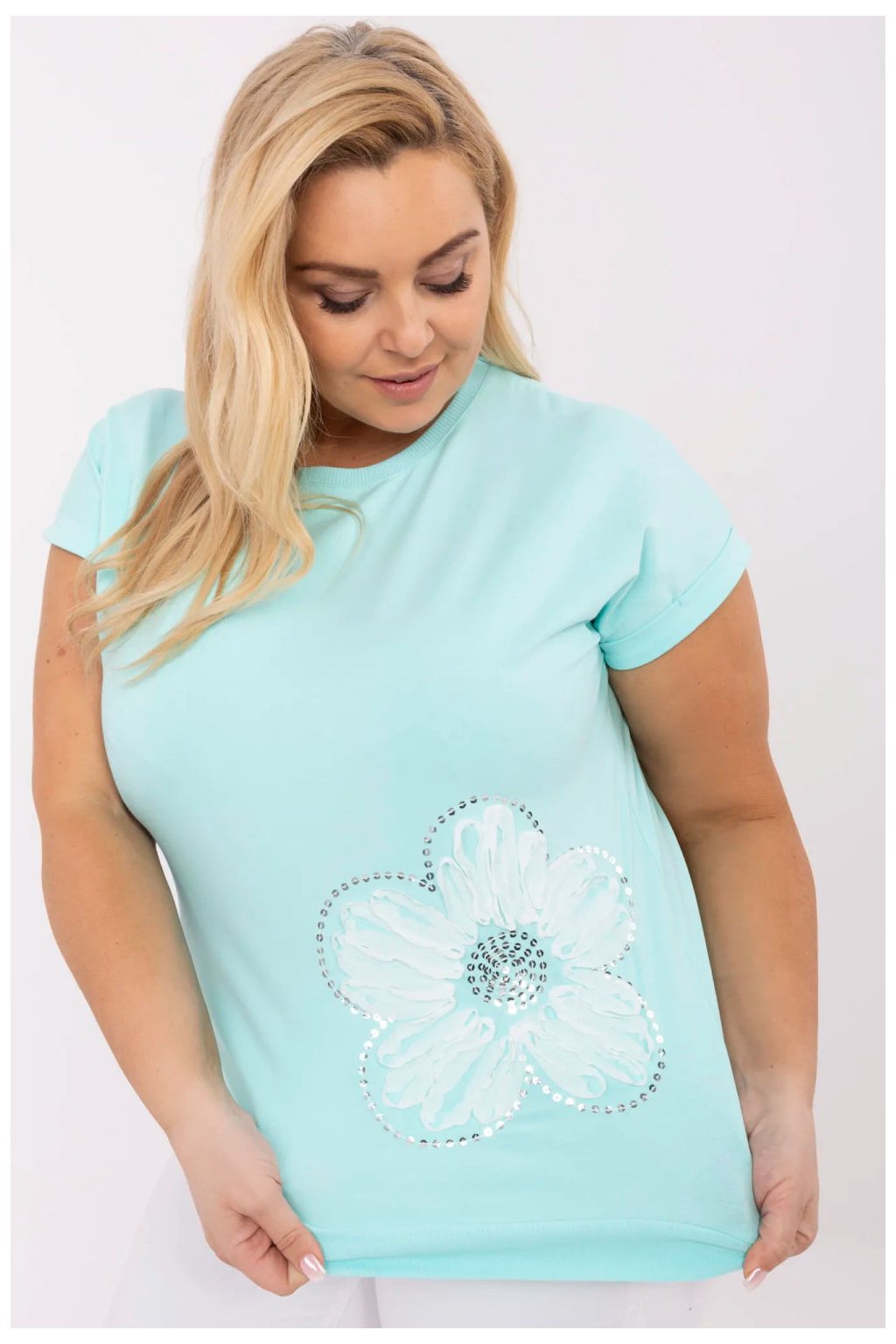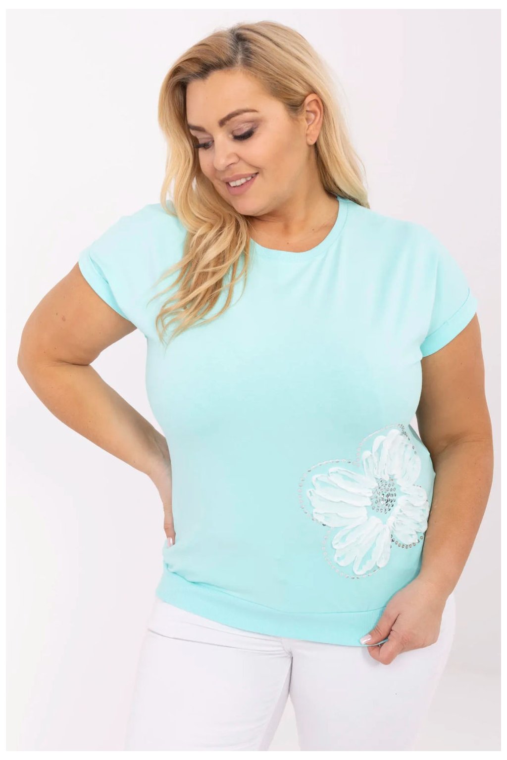Tato casualová košile ve velikosti plus je ideální volbou na každý den pro ženy, které ocení pohodlí a jemné ozdobné akcenty. Vyrobena z měkké, elastické látky, která kombinuje bavlnu a elastan, poskytuje pohodlí nošení a volnost pohybu. Klasický, kulatý výstřih a standardní délka dělají košili skvěle sladěnou jak s kalhotami, tak s sukní. Krátký rukáv jí dodává lehkost a aplikace s flitry přidává lesku a zdůrazňuje individuální styl. Model nemá žádné zapínání, stačí ji obléknout a užívat si pohodlí po celý den.