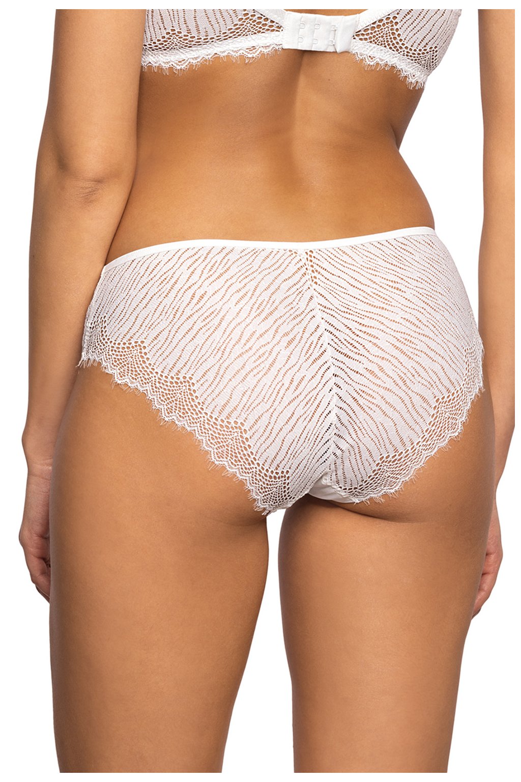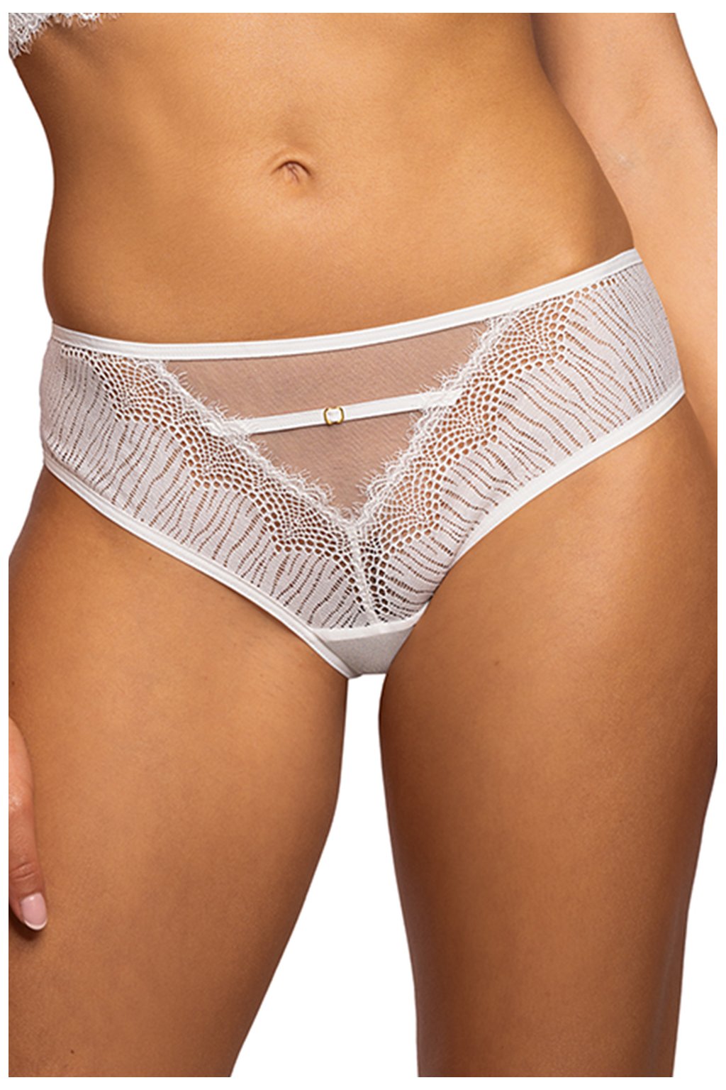 Dámské kalhotky klasického střihu s plnou zadní částí. Kalhotky jsou celé vyrobené z krajky a síťoviny, mají bavlněný klín.
