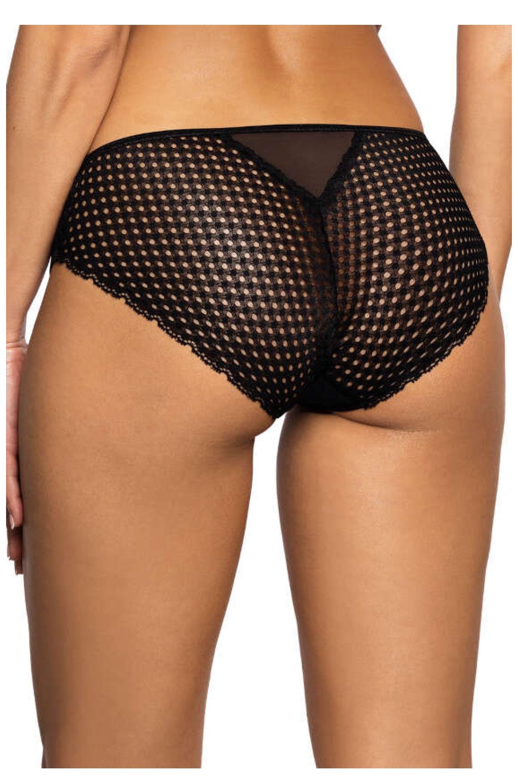 Očarující svou jemností jsou černé figové kalhotky Marley. Vepředu mají vložky z krajkové krajky spojené s elastickou síťkou. Zadní strana je také z krajky, která krásně zdůrazňuje ženské kouzlo. Kalhotky se ideálně přizpůsobují tělu.