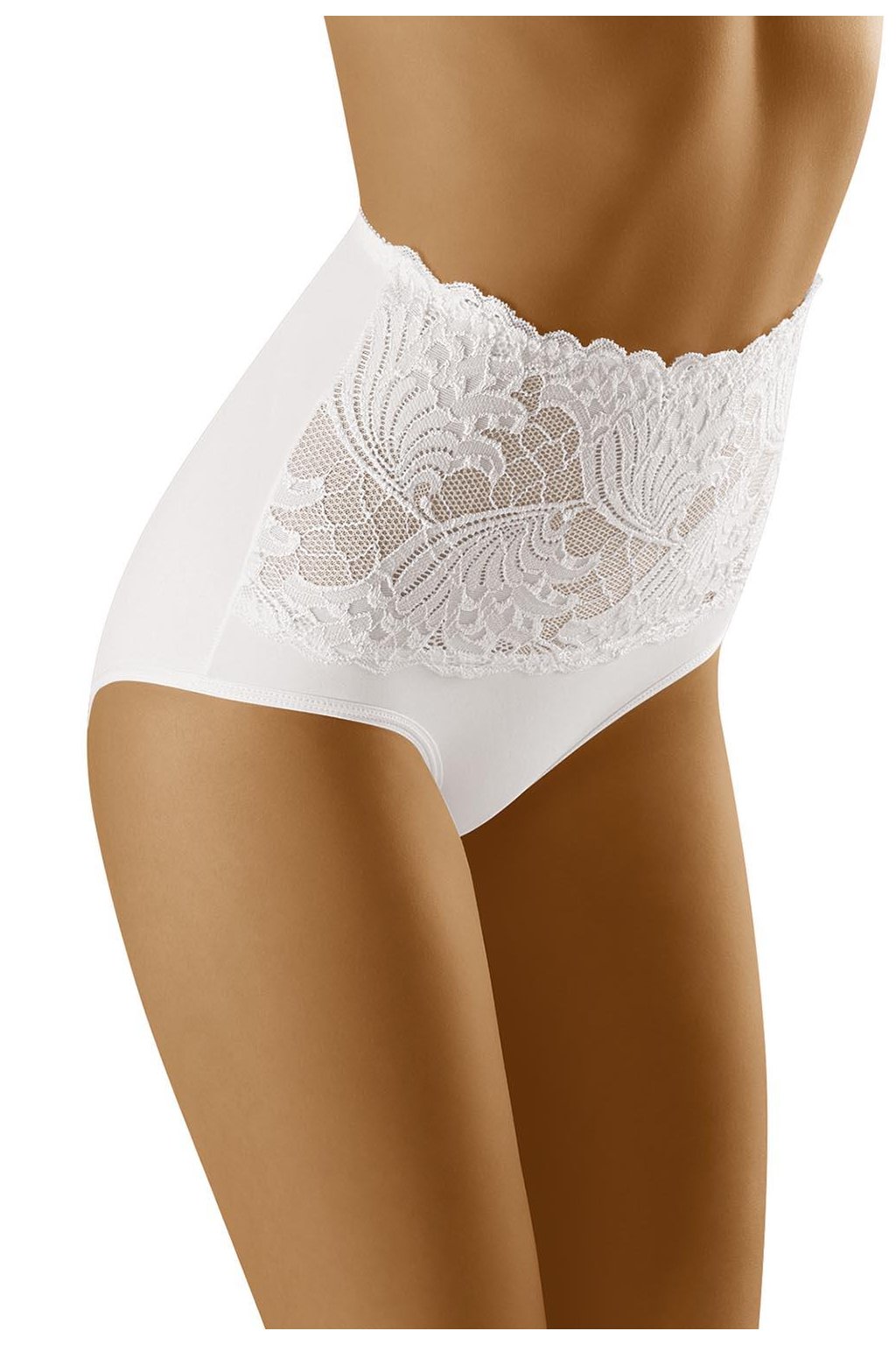Kalhotky s vysokým pasem mírně tvarují bříško. Přední díl zdobený krajkou, zadní díl hladký. Funkční a přesto elegantní.