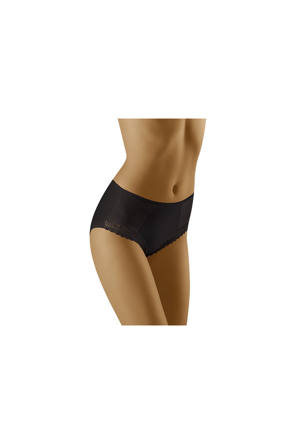 Pohodlné kalhotky, jejichž přední část je zdobena prolamovaným vzorem a'la kabaret. S hladkými zády. Klasický střih, mírně vyšší, lehce tvaruje bříško. Zdobení kolem stehen.