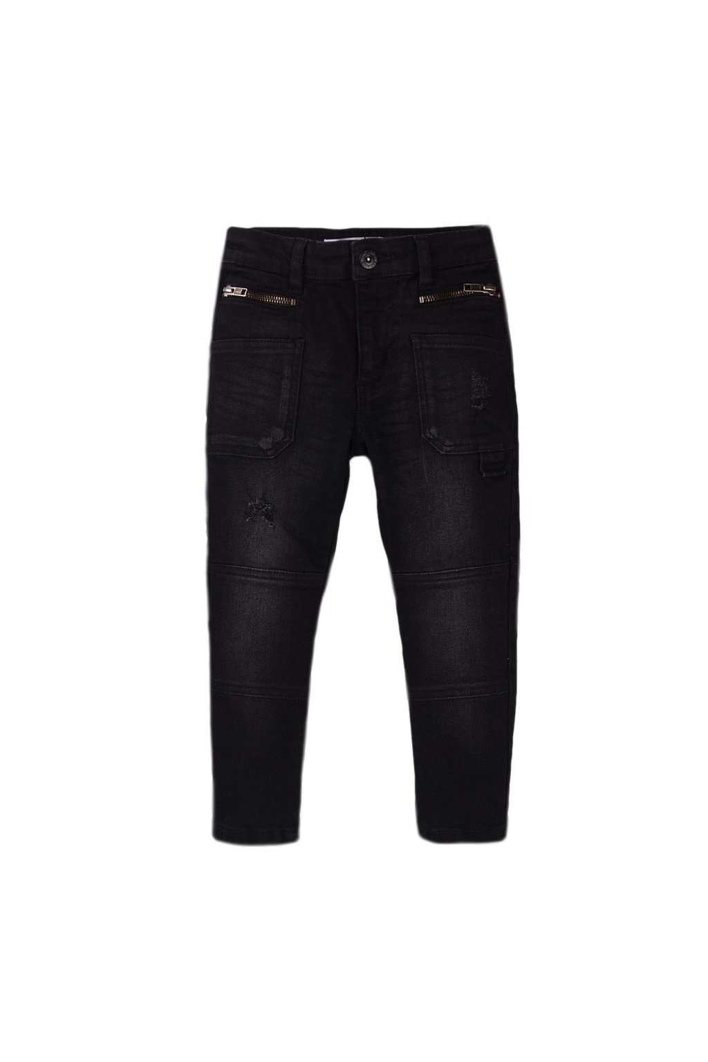 Chlapecké černé džínové kalhoty s elastem. Kalhoty mají dvě přední i zadní kapsy a taky dvě malé přední kapsy na zip.