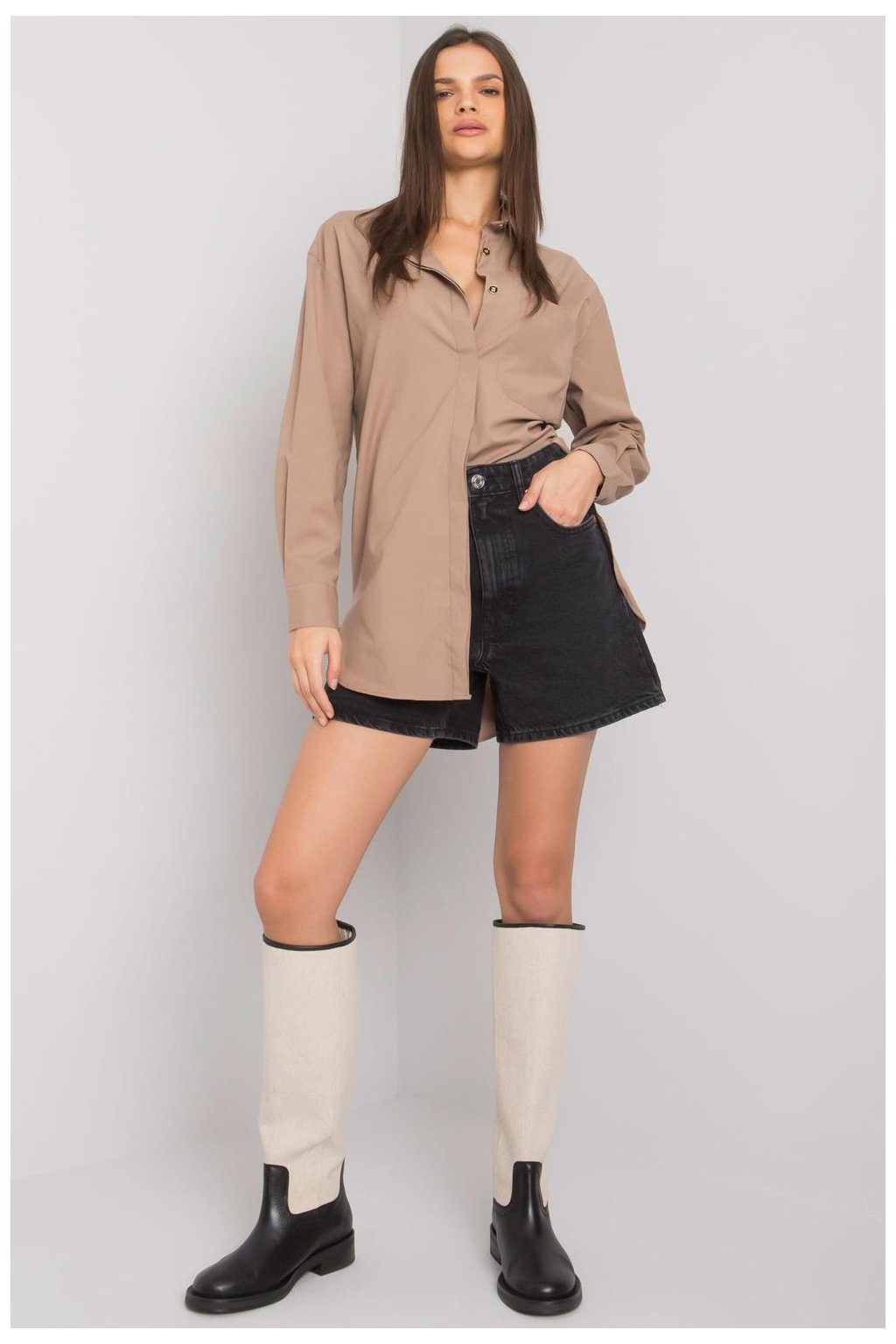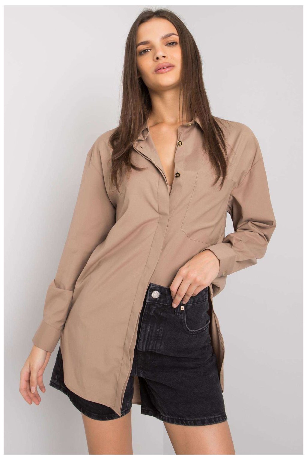 Béžová dámská prodloužená košile s dlouhými rukávy. Košile je zapnutá.