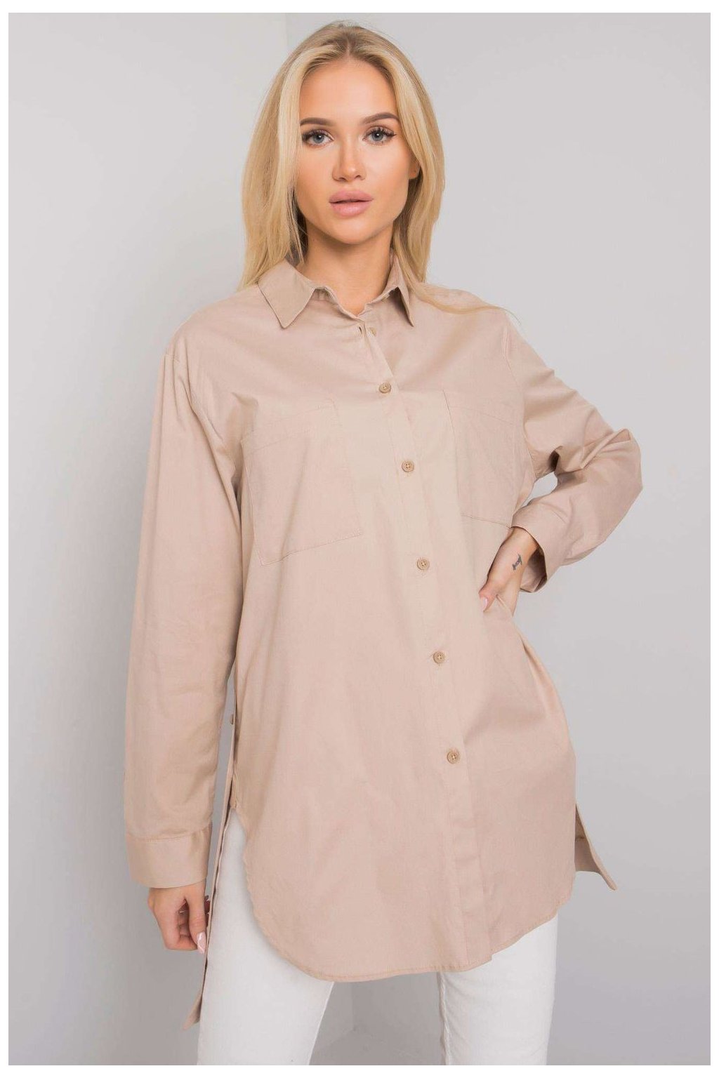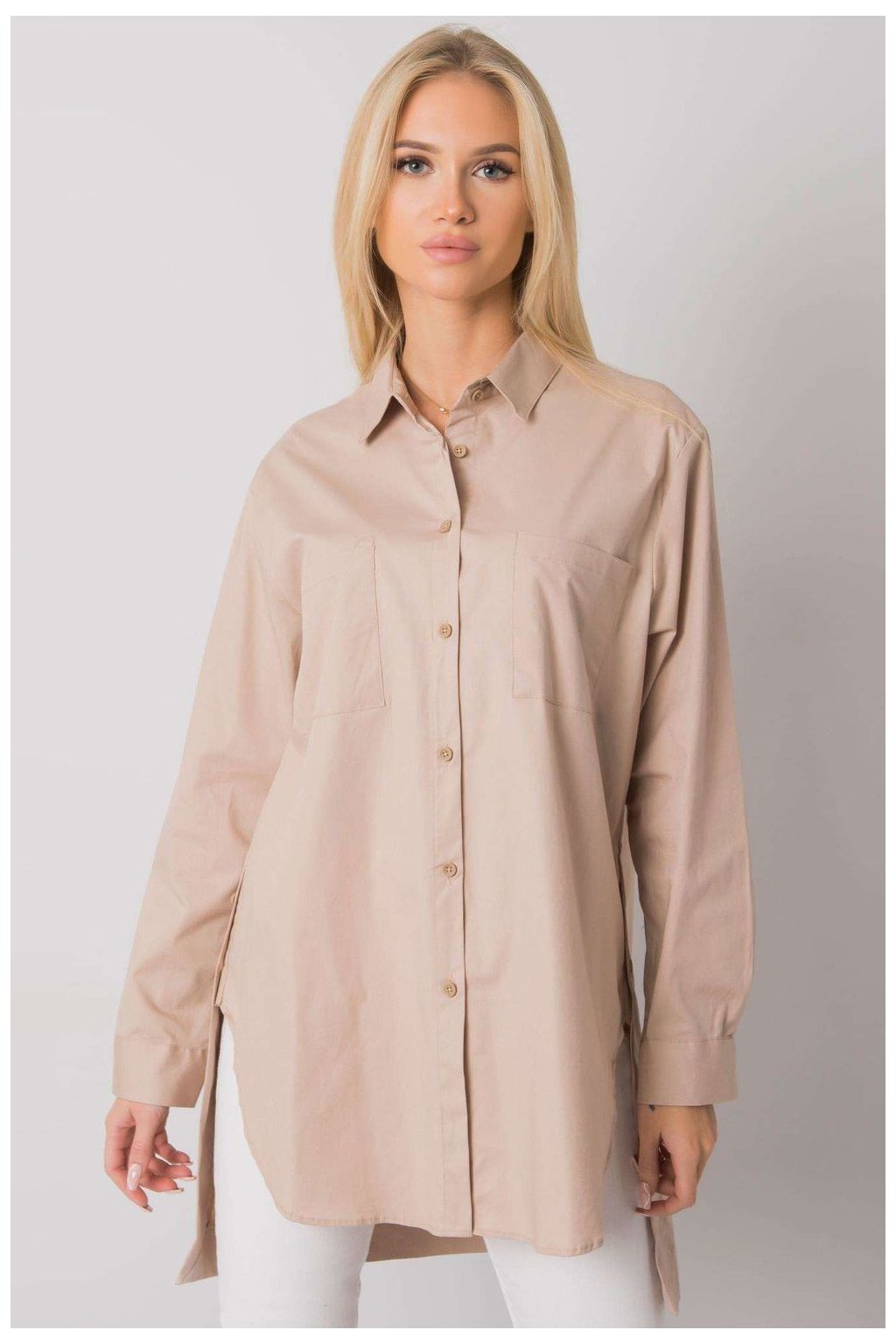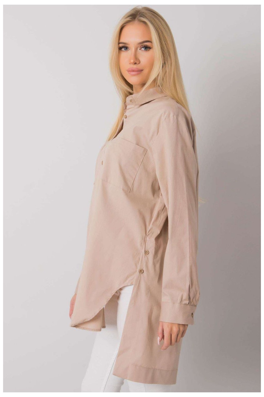 Béžové bavlněné tričko s prodlouženým střihem a dlouhými rukávy. Košile je zapnutá.