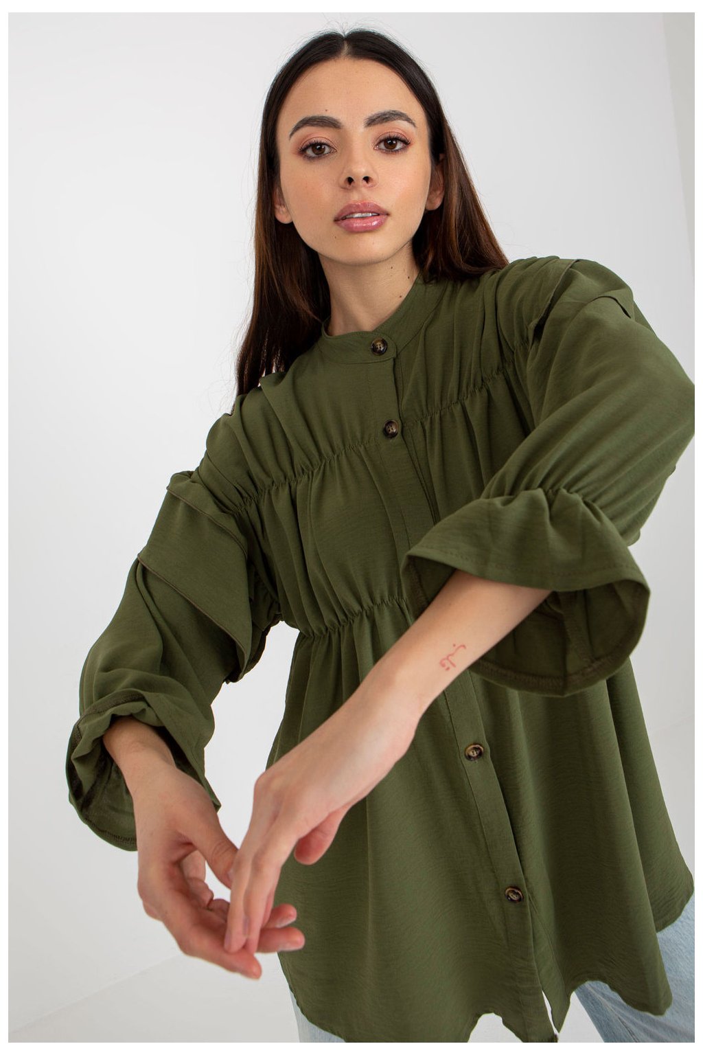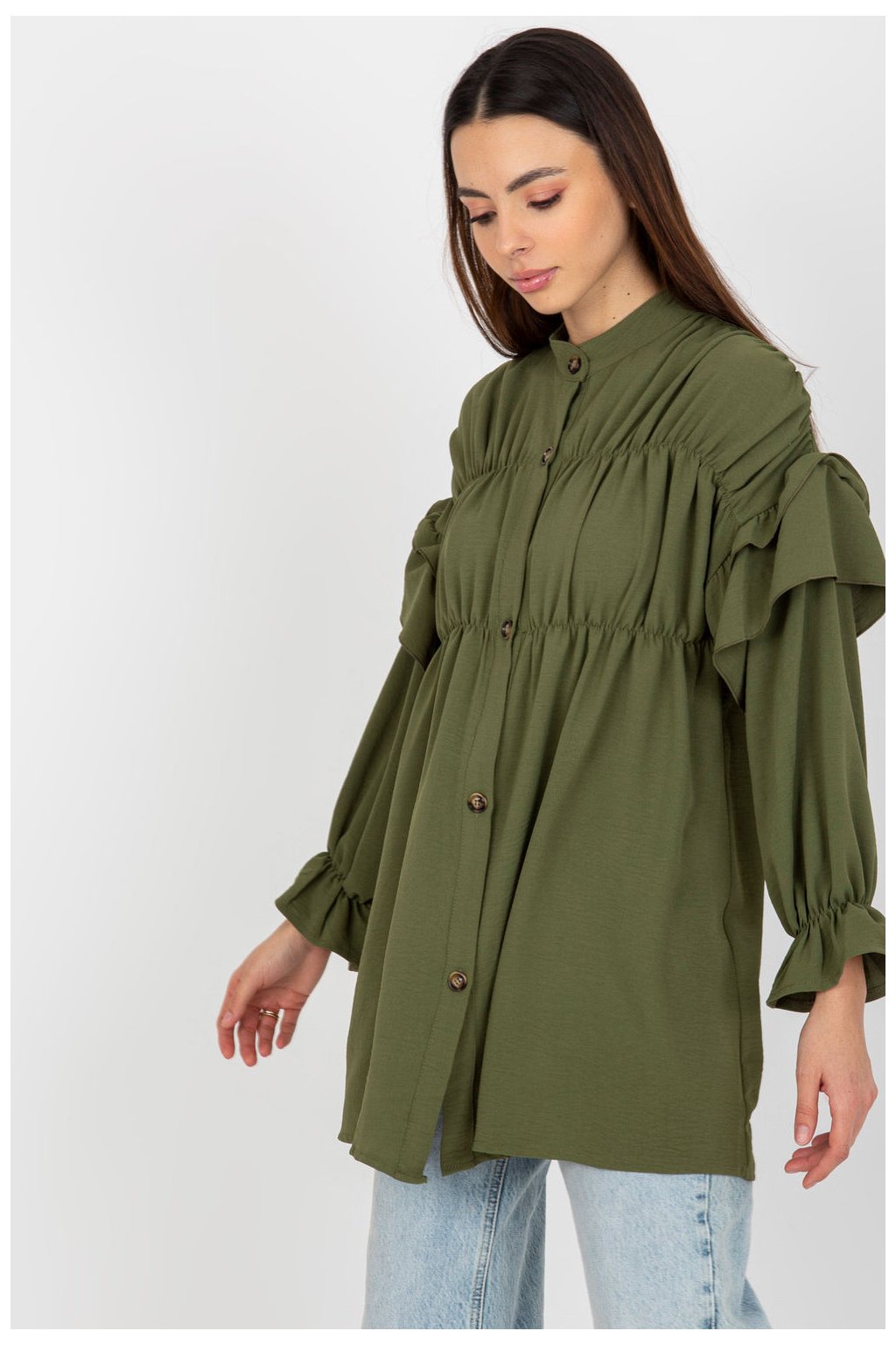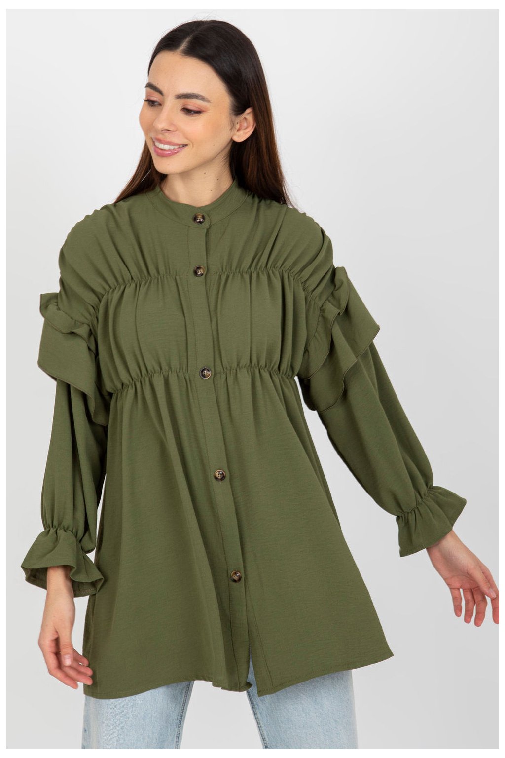 Dámská košile volného střihu se zapínáním na knoflíky. Košile s dlouhými rukávy a ozdobnými volánky.