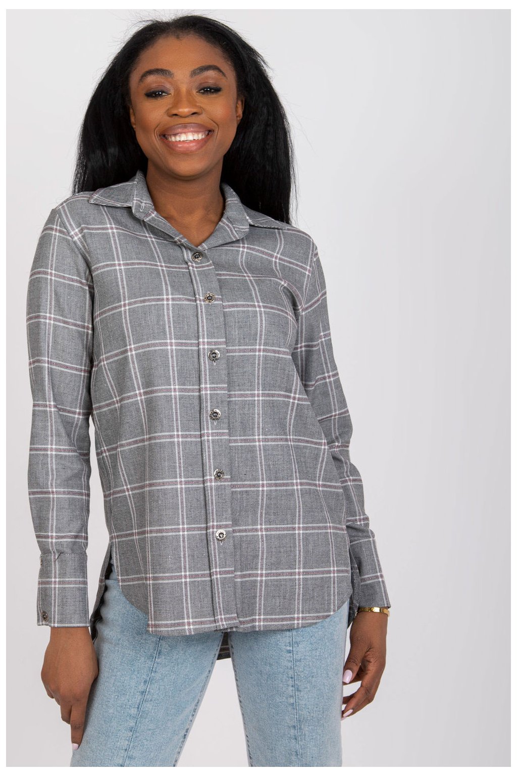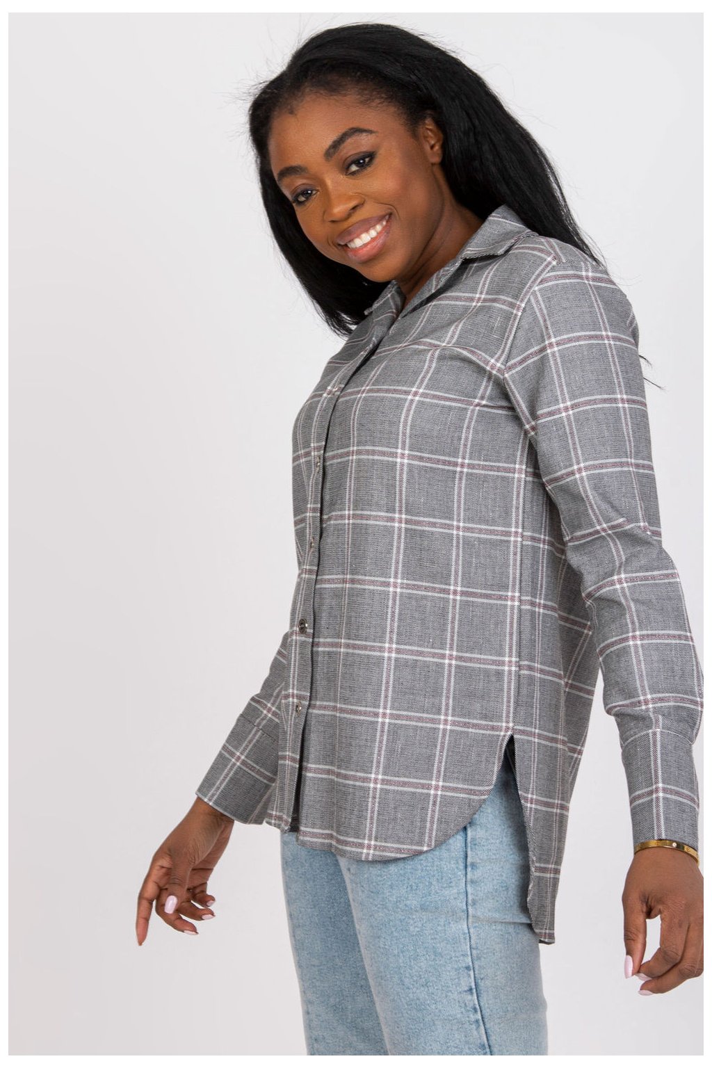 Šedá dámská kostkovaná košile s dlouhými rukávy a zapínáním na knoflíky.