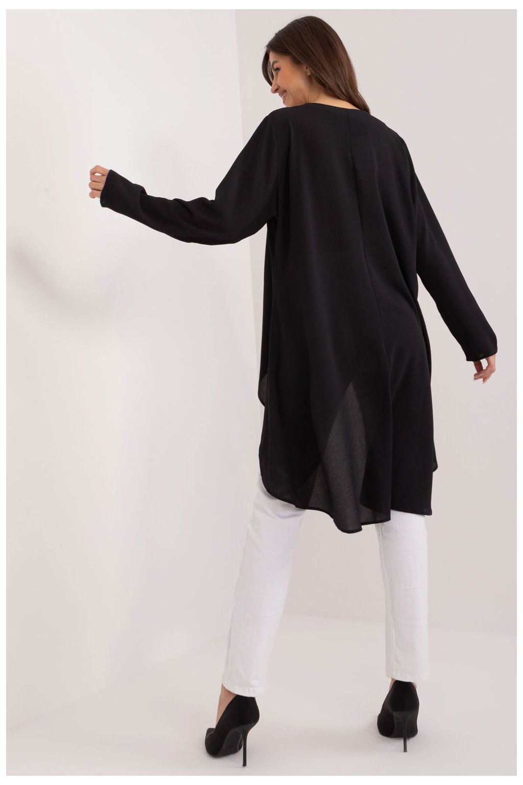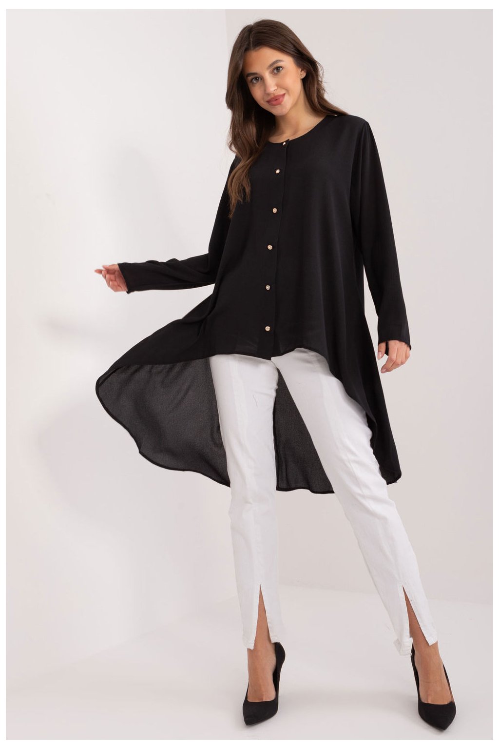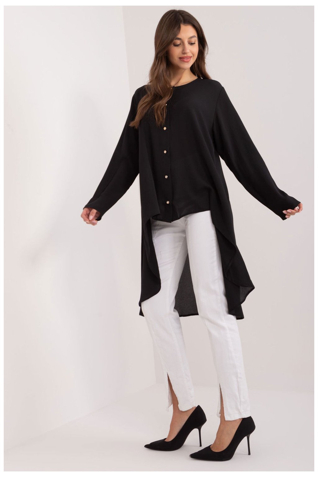 Elegantní košile s dlouhými rukávy je sofistikovaný kousek oblečení, který se hodí pro různé situace, od běžných až po formálnější příležitosti. Její pečlivě navržený střih klade důraz na jemnost a eleganci a splňuje jak požadavky práce, tak potřeby stylového každodenního nošení. Spodní část košile, provedená asymetrickým způsobem, jí dodává moderní nádech a zároveň zůstává v souladu s klasikou. Zapínání na knoflíky umístěné podél přední části košile usnadňuje její oblékání a svlékání a zároveň jí dodává dekorativní prvek. Dominantním vzorem je hladký povrch, díky němuž je košile univerzální a snadno kombinovatelná s různými styly. Dominantní materiál, bavlna, zaručuje pohodlí a prodyšnost, takže se hodí jak pro teplejší, tak pro chladnější dny. Kulatý výstřih dodává košili eleganci a zároveň zůstává nadčasový a univerzální. Je ideální volbou pro ženy, které si chtějí zachovat svůj styl jak na pracovišti, tak v každodenních situacích, kdy elegance a pohodlí jdou ruku v ruce.