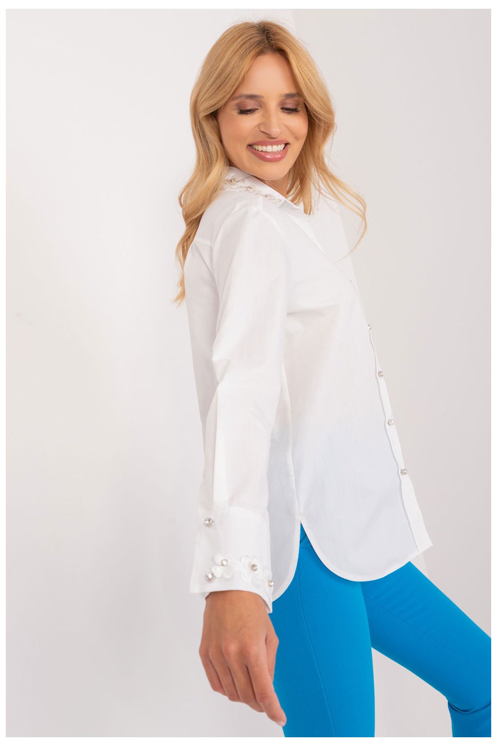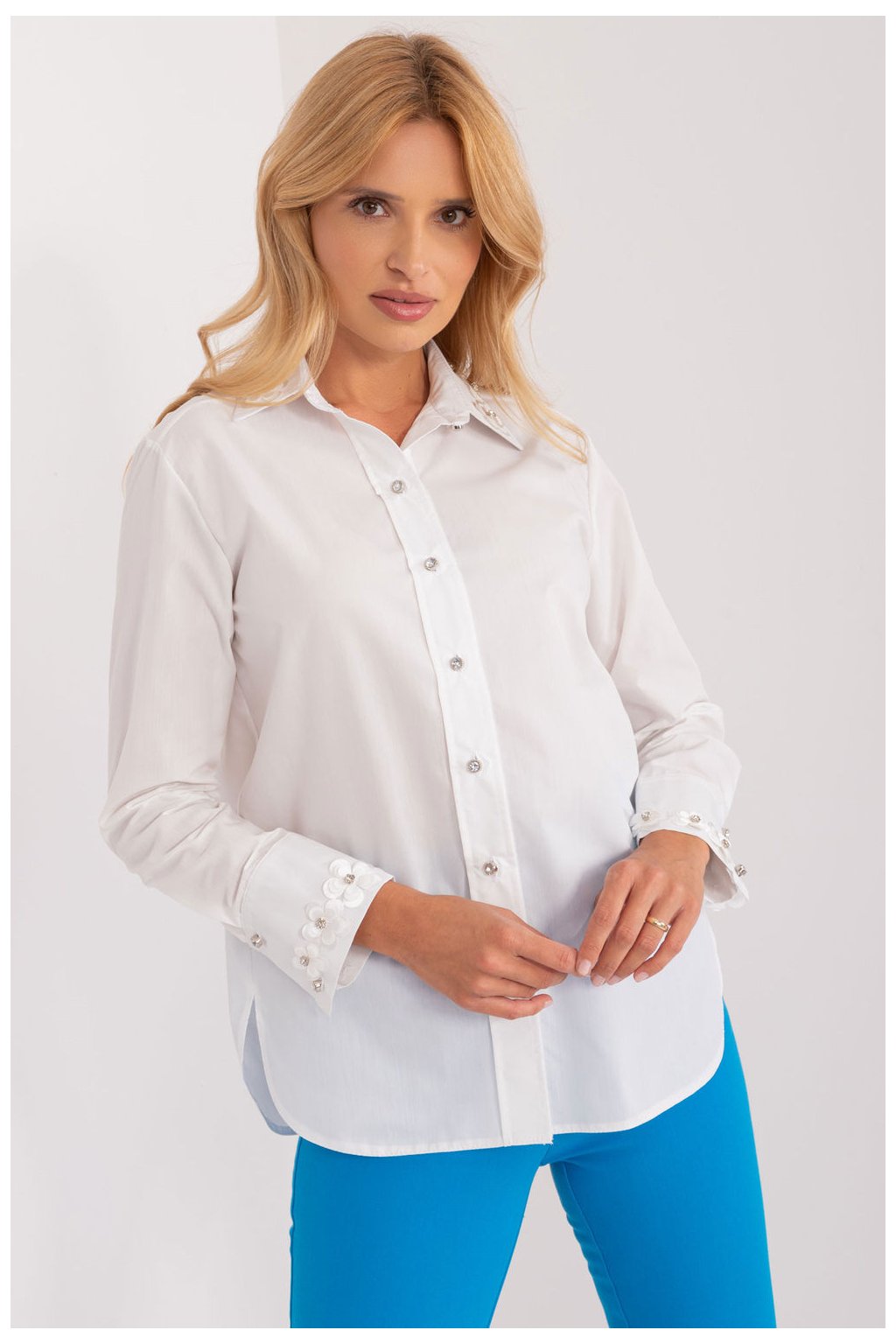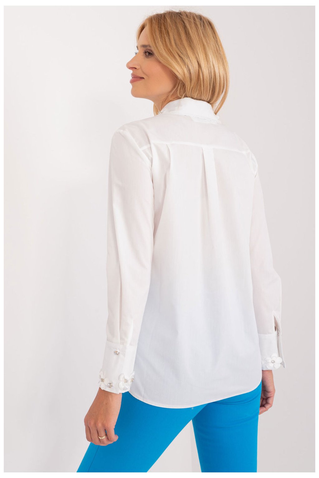 Klasická košile je esencí elegance a profesionality, ideální pro každý den v kanceláři nebo na obchodní schůzky. Její pečlivě propracovaný design a jedinečné detaily z ní činí nepostradatelný kousek dámského šatníku. Klasický styl této košile podtrhuje eleganci, takže je ideální volbou pro pracovní i formální příležitosti. Je vyrobena z vysoce kvalitní bavlny s hladkým omakem, poskytuje pohodlné nošení a odolnou tkaninu. Díky standardní délce a dlouhým rukávům je košile univerzální a perfektně funguje po celý rok. Límeček a knoflíková léga jí dodávají klasický vzhled a podtrhují formální vzhled. Jedinečným ozdobným prvkem jsou vyšívané květiny a ozdobné zirkony umístěné na manžetách. Tyto jemné detaily dodávají košili nádech ženské jemnosti, přičemž příliš nevtíravě nezdůrazňují její elegantní charakter. Tato klasická košile je spojením tradice a modernosti, což z ní činí nepostradatelnou součást dámského pracovního šatníku, kde se elegance snoubí s jemností.