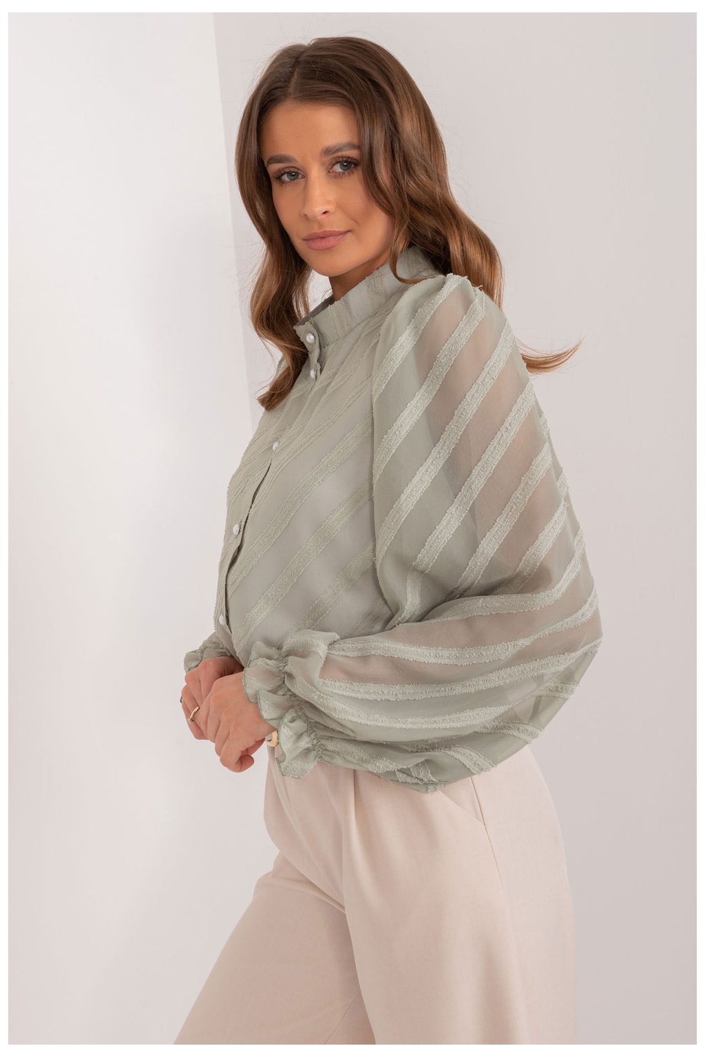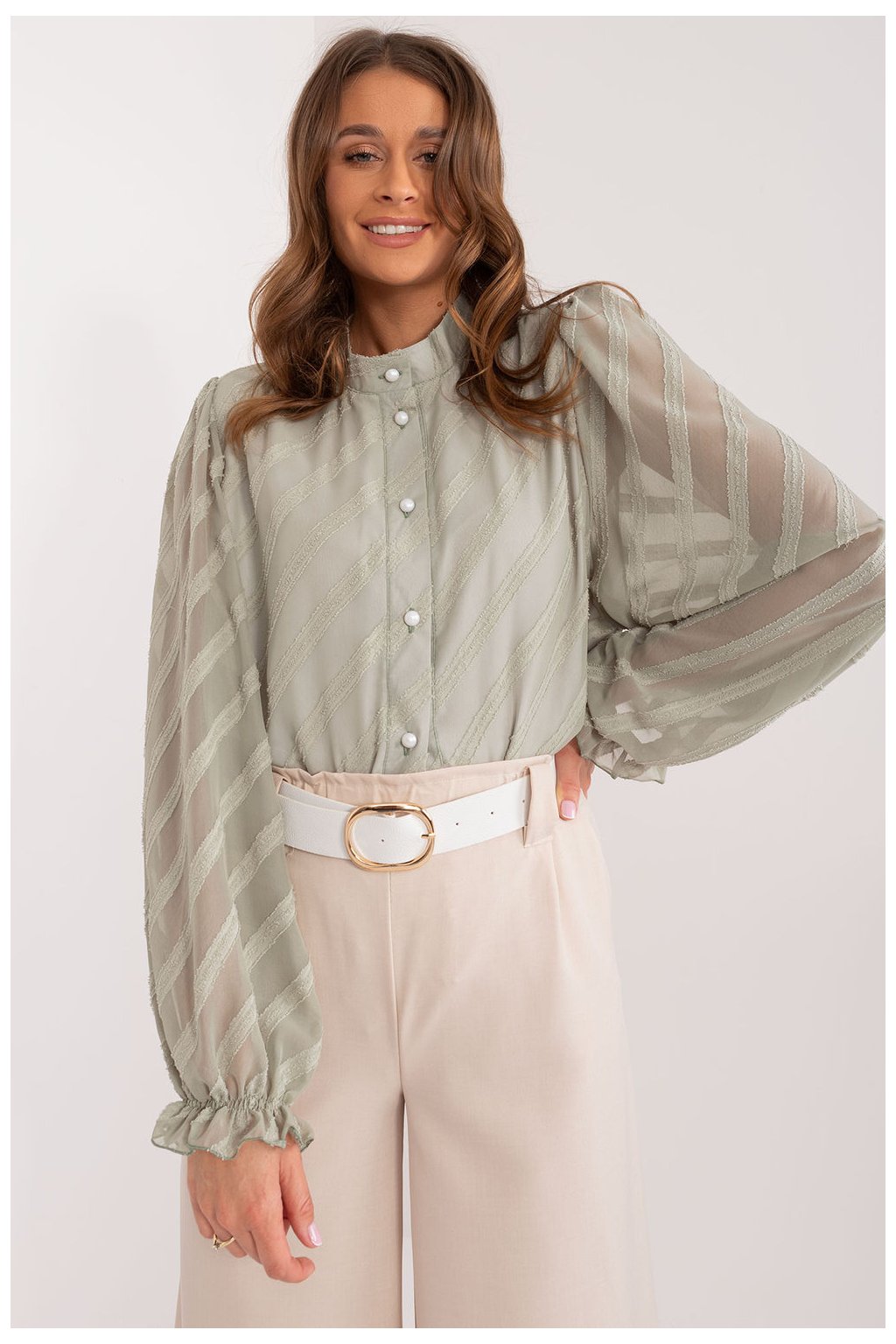 Tato klasická dámská košile na knoflíky je kvintesencí elegance a stylu a je ideální pro různé příležitosti, zejména pro pracovní a obchodní schůzky. Pestrá struktura látky jí dodává jedinečný charakter, přitahuje pozornost a podtrhuje osobnost ženy, která ji nosí. Košile má standardní délku, která zaručuje pohodlné nošení a správné proporce pro nošení přes kalhoty i k sukni. Dlouhý rukáv z průhledného materiálu dodává košili jemnost a delikátnost a zároveň podtrhuje eleganci celého designu. Stojatý límec dodává košili sofistikovaný nádech a zároveň dodává nositeli sebevědomí. Díky přítomnosti podšívky je navíc tato košile mimořádně příjemná a pohodlná na nošení a poskytuje pocit luxusu a pohodlí po celý den. Díky svému nadčasovému designu a vysoké kvalitě zpracování je tato dámská košile nejen základem šatníku, ale také výrazem sebevědomí a elegance pro každou ženu, která ji nosí.